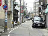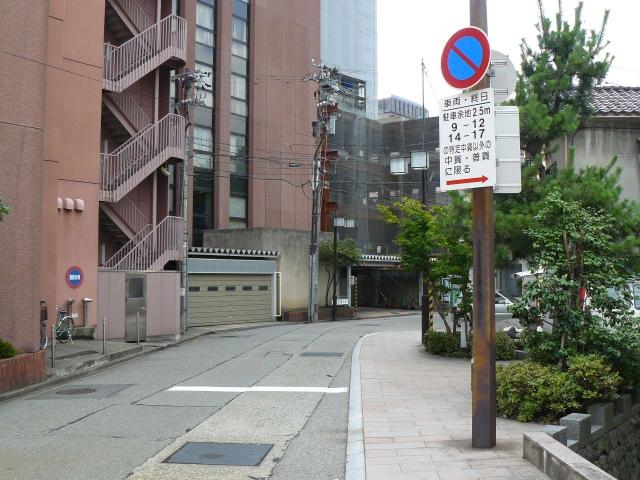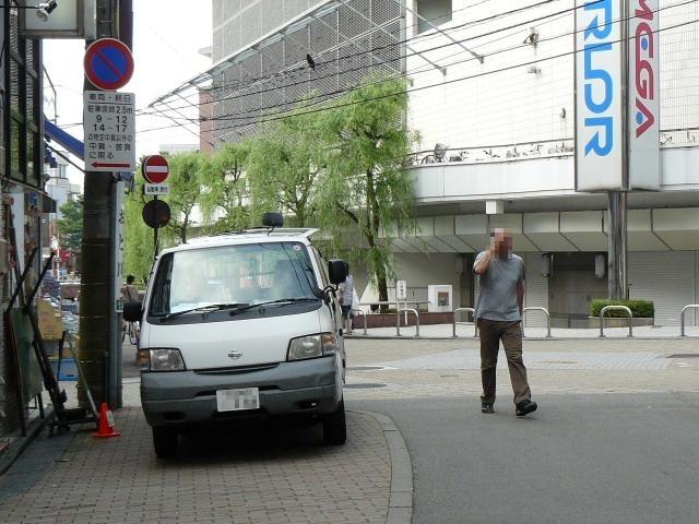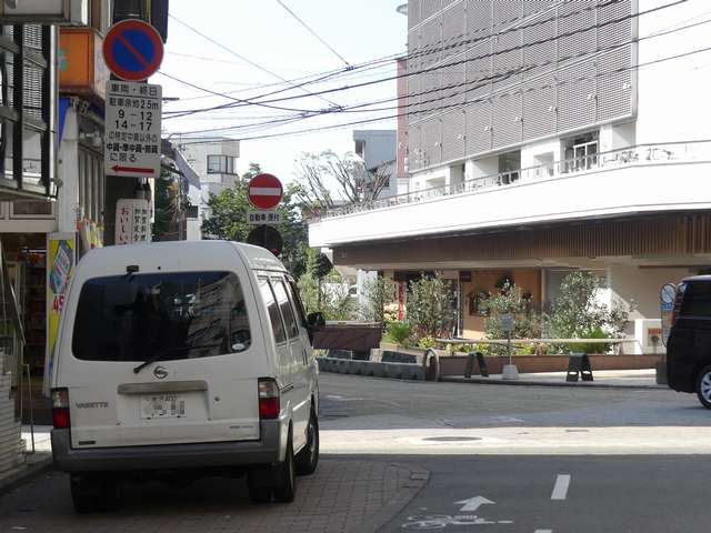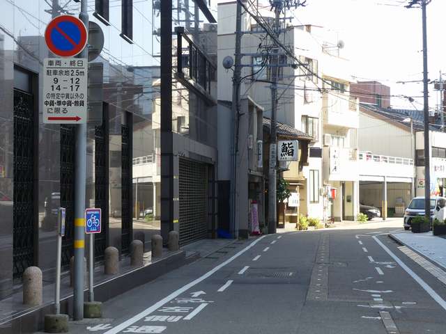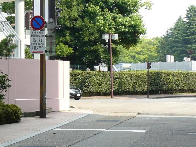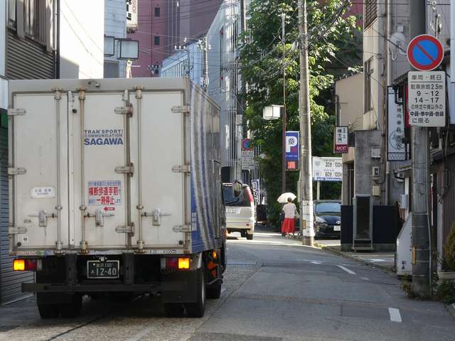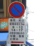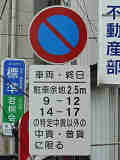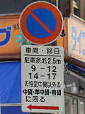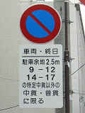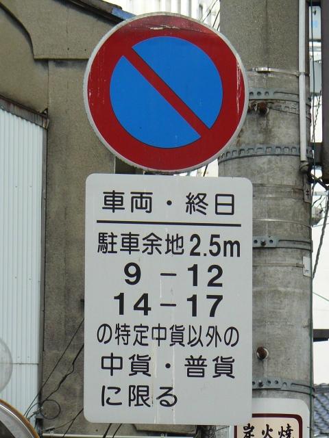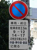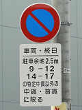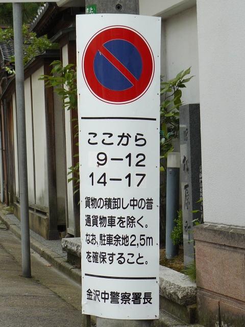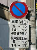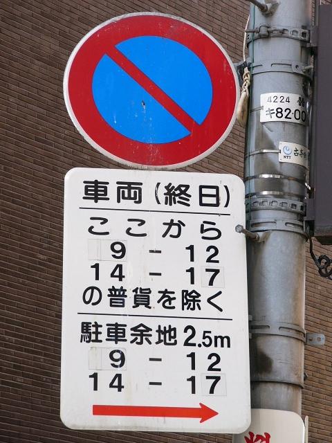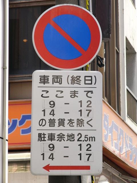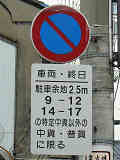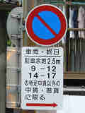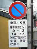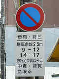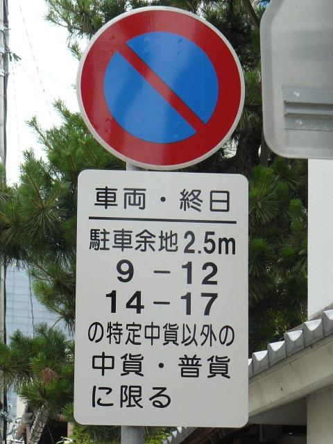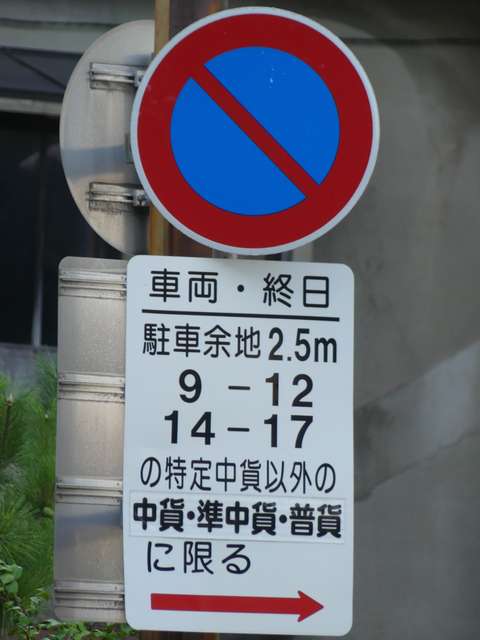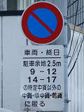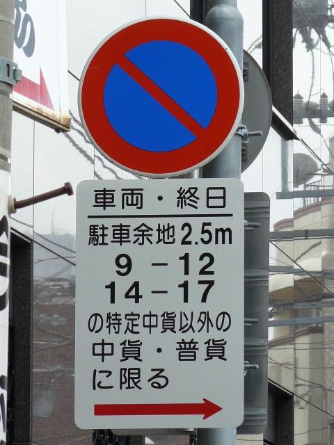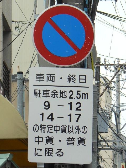 なお、区間内にはこれまた意味不明な立て看板があります。この表示ではいろいろな意味にとられてしまいます。また、標識とは異なり、貨物積降し中の普貨(法令改正後の特定中貨以外の中貨・普貨)に限定しています。 なお北進南進両方向とも、区間内に、補助標識の無い「駐車禁止」標識が何箇所か設置されています。要は「駐車禁止(車両・終日)」標識にあたるものが、「駐車余地」標識から独立して設置されているわけです。このことからも、やはり区間内では余地の有無にかかわらず、全車両が終日「駐車禁止」となると思います。(しかし実際、警察の狙いとしては、道路の狭い部分で駐車できる側をどちらかに限定するための対応のように思います。) 区間内の路上の所々に駐車余地2.5mとなる目安のラインが引かれていますが、1台1台の駐車場所を区切っていないので道路標示「平行駐車」ではないようです。