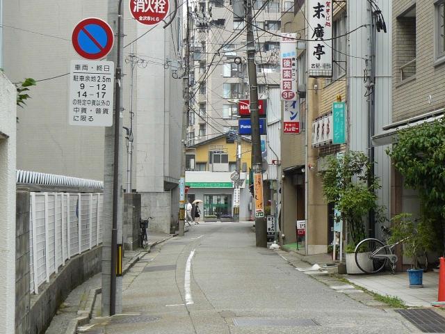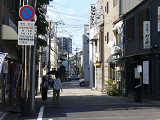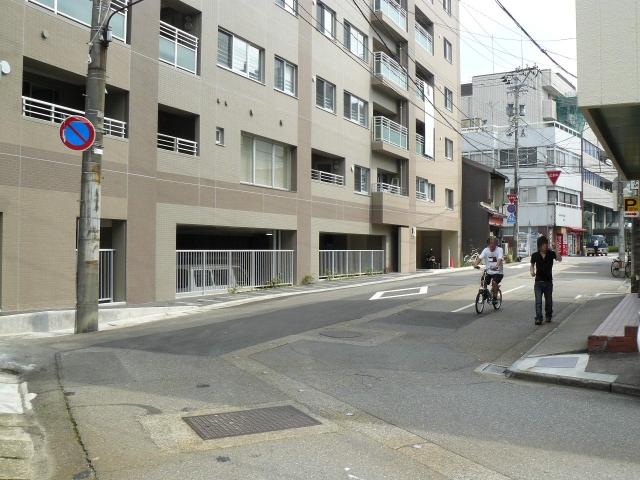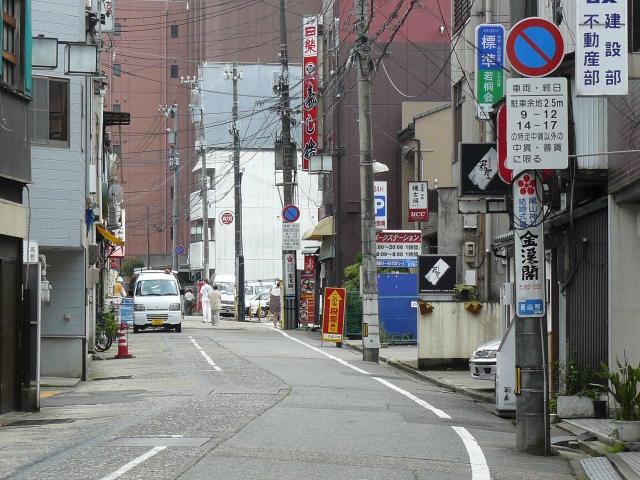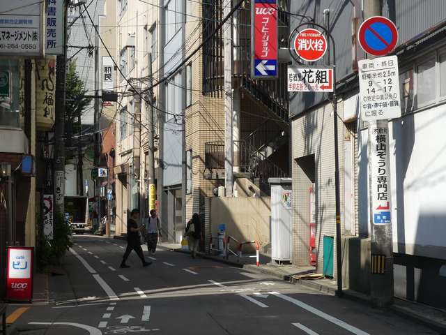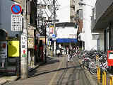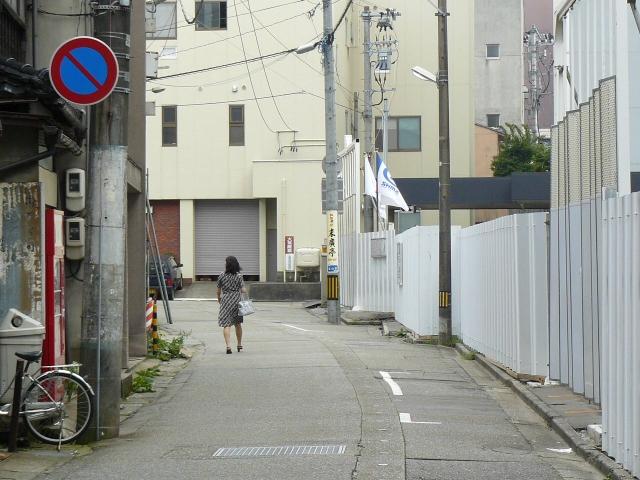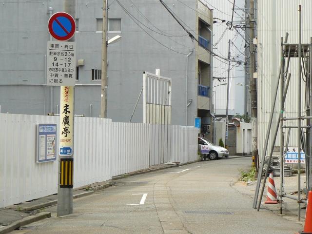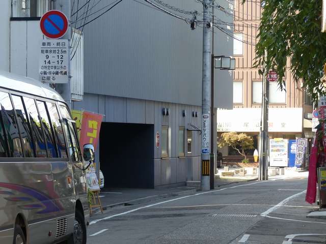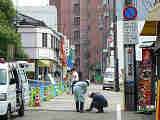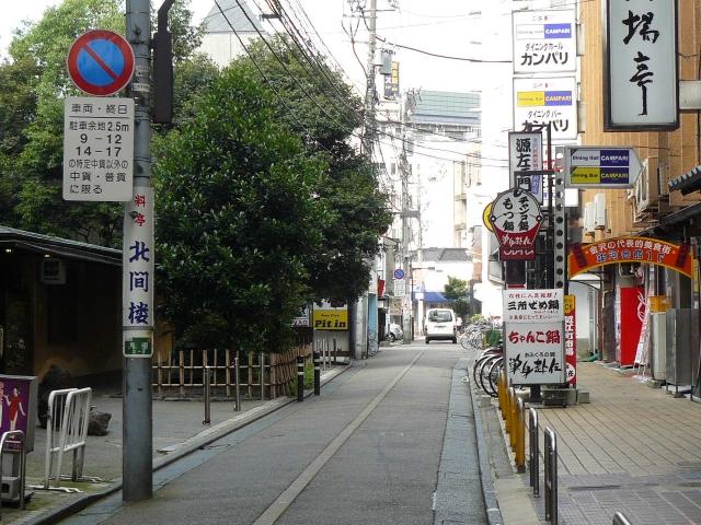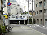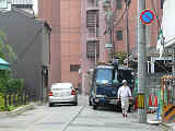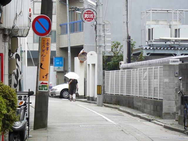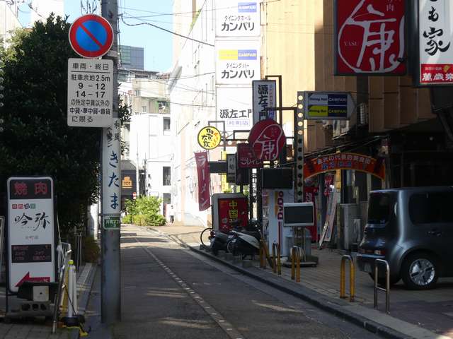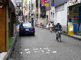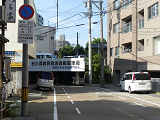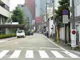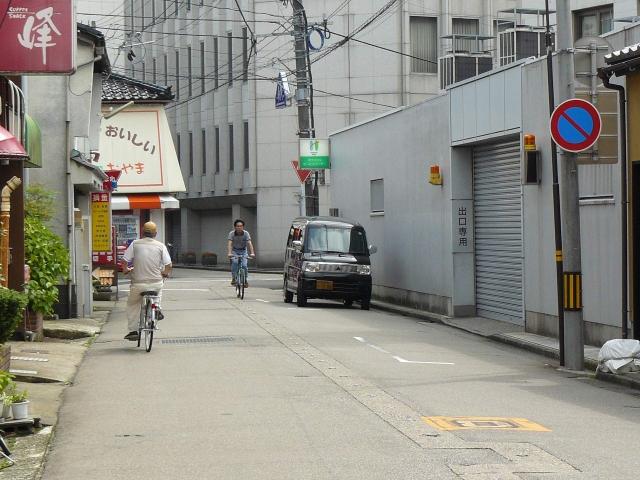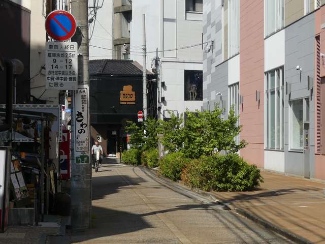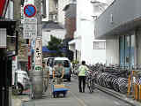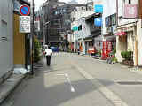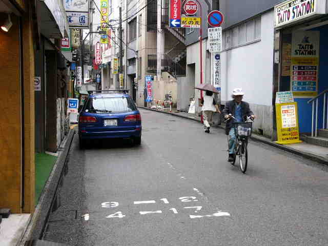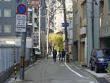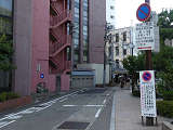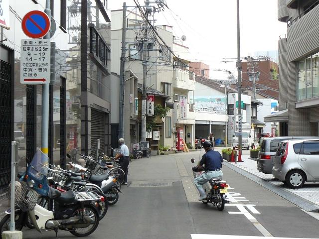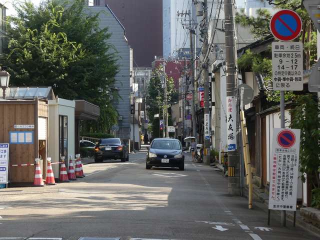 なお、区間内にはこれまた意味不明な立て看板があります。この表示ではいろいろな意味にとられてしまいます。また、標識とは異なり、貨物積降し中の普貨(法令改正後の特定中貨以外の中貨・普貨)に限定しています。 なお北進南進両方向とも、区間内に、補助標識の無い「駐車禁止」標識が何箇所か設置されています。要は「駐車禁止(車両・終日)」標識にあたるものが、「駐車余地」標識から独立して設置されているわけです。このことからも、やはり区間内では余地の有無にかかわらず、全車両が終日「駐車禁止」となると思います。(しかし実際、警察の狙いとしては、道路の狭い部分で駐車できる側をどちらかに限定するための対応のように思います。) 区間内の路上の所々に駐車余地2.5mとなる目安のラインが引かれていますが、1台1台の駐車場所を区切っていないので道路標示「平行駐車」ではないようです。