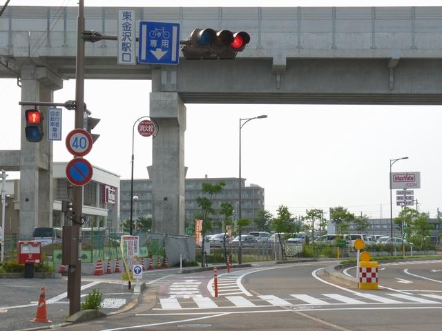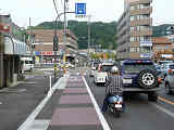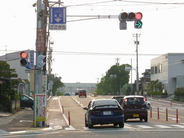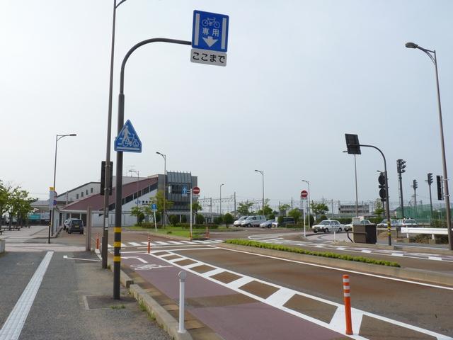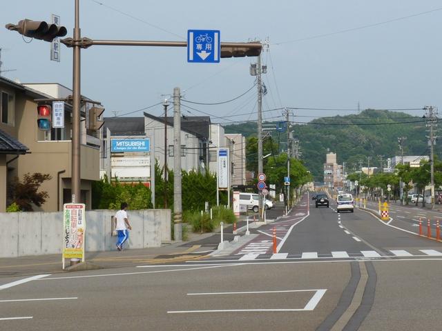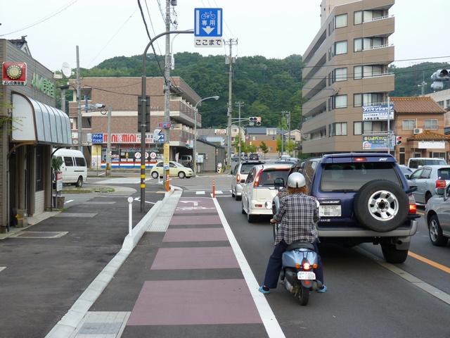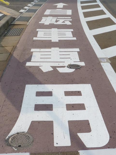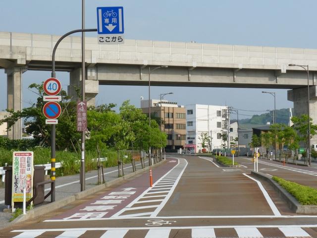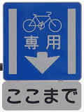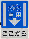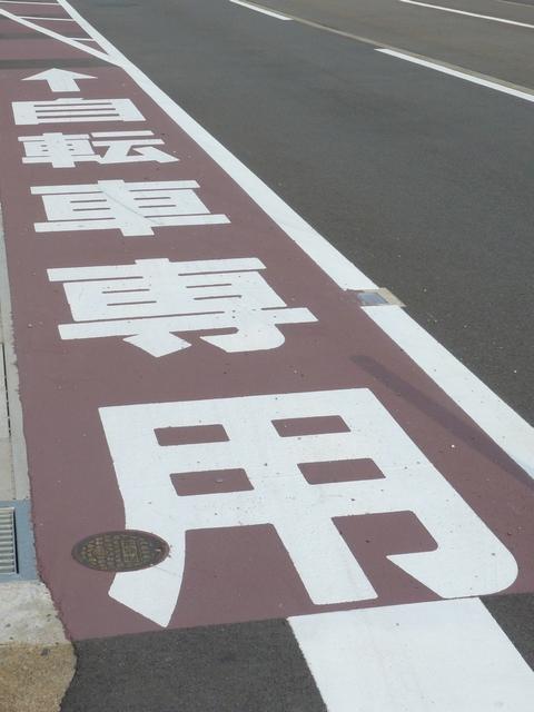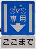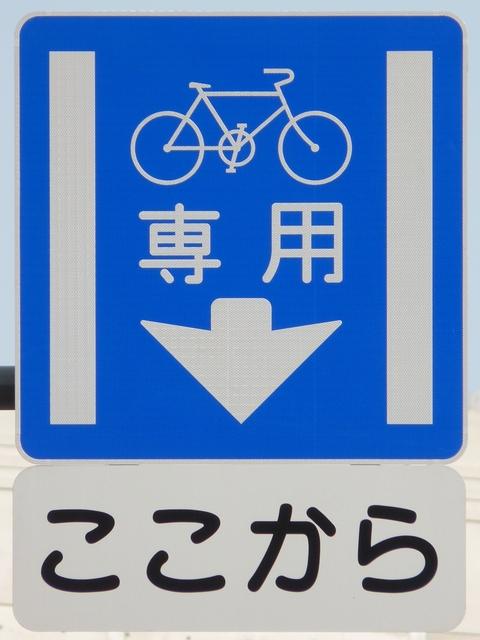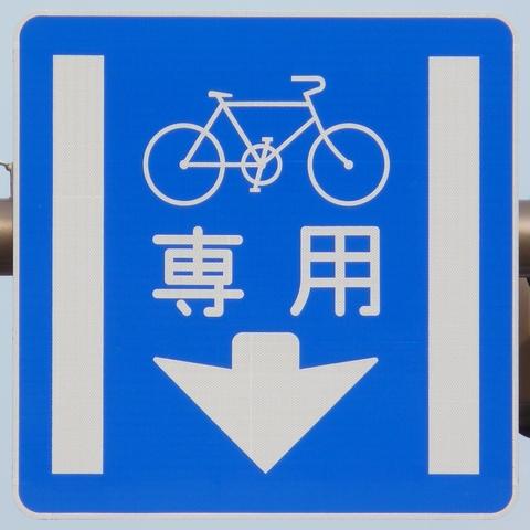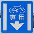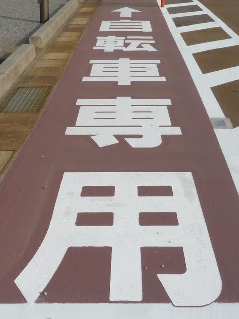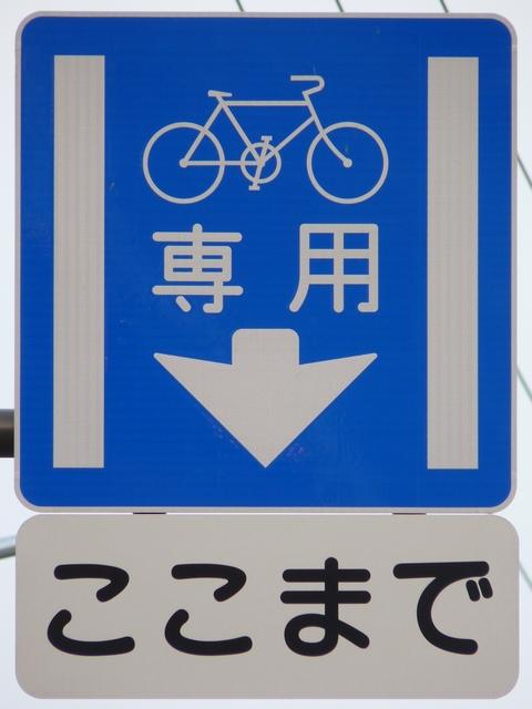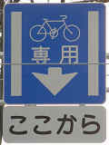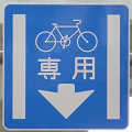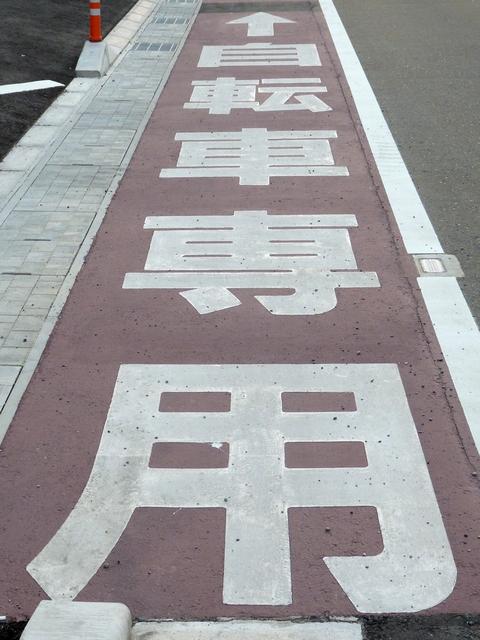 平成22年4月に供用開始された自転車の「専用通行帯」です。標識は、区間の始まりと終わり、信号交差点(押ボタン式信号の横断歩道を除く)の先に設置されています。道路標示は、区間の始まりと信号交差点(同)の先に設置されています。警察庁の通達では路面を塗装する場合は青系の色となっていますが、ここでは街並みの景観を考慮して灰桜色となっています。
