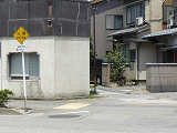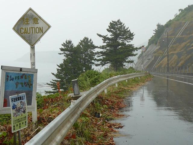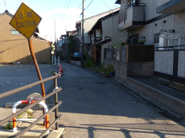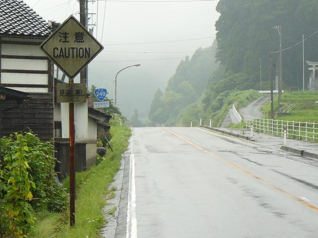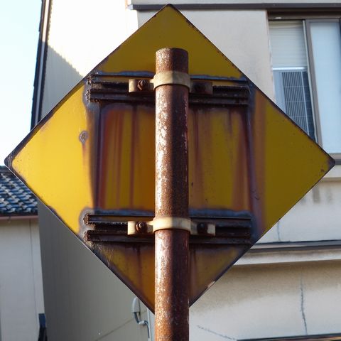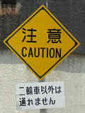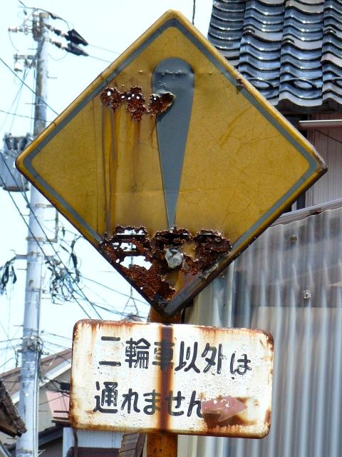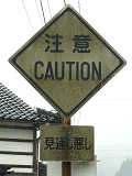 さびさびで状態の悪い鉄板製の「その他の危険」標識、しかし区間の反対側は逆にアルミ製で状態のよい先代の旧型標識「注意」があります。