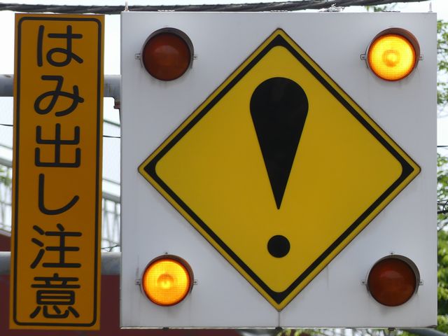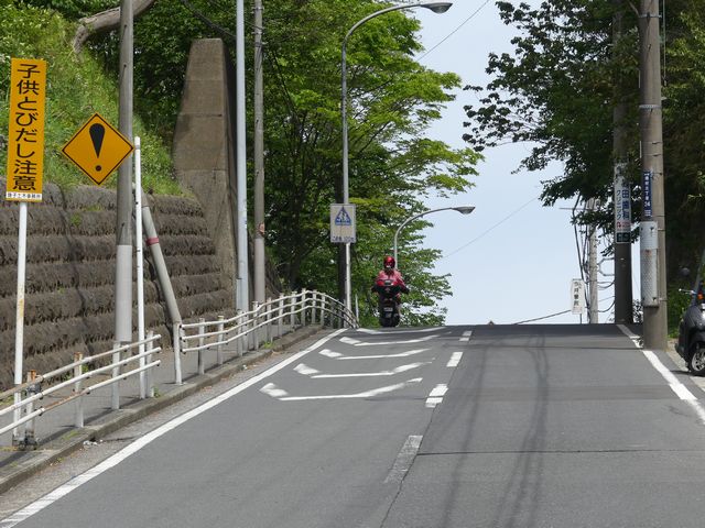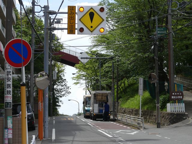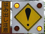 この先が道路の両方向から見て坂道の頂上となっており見通しが悪いため、対向車線にはみ出すときは注意するよう「その他の危険」標識が設置されています。南進方向では、首都圏でよく見られる標示板の4隅に黄灯火が埋め込まれた標識が設置されています。