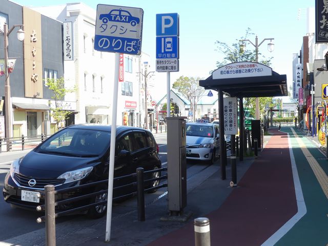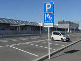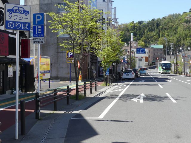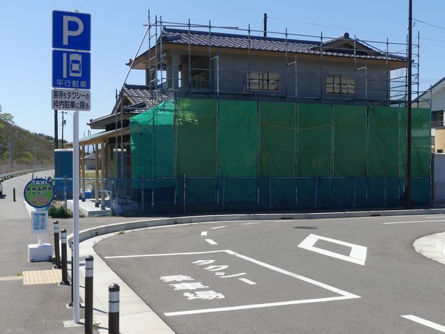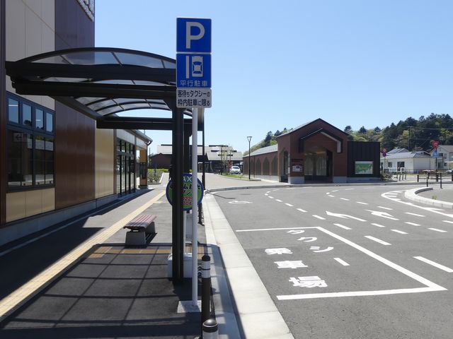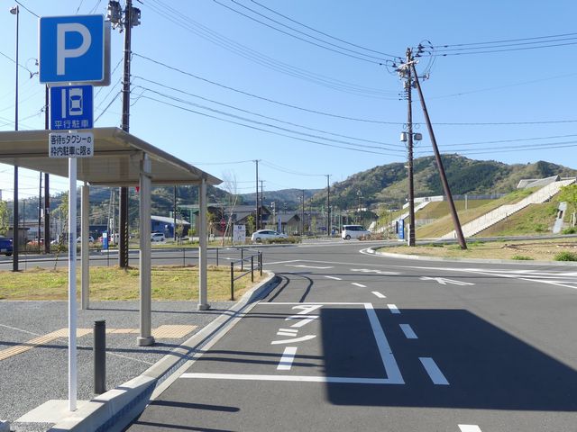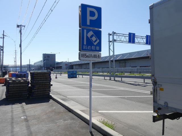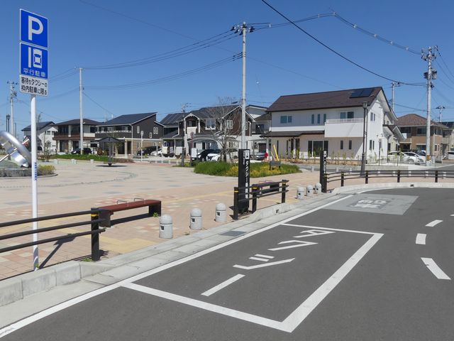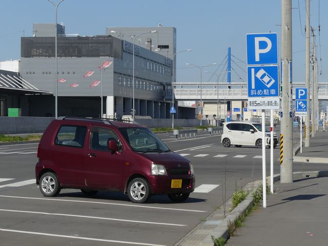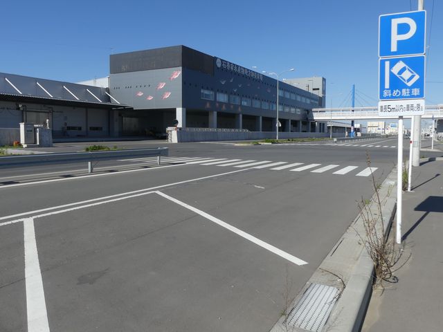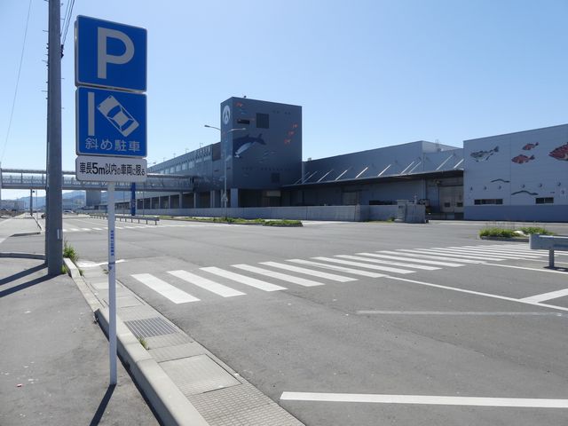 石巻魚市場前の片側2車線道路の副道のような部分約700mの区間に「駐車可」標識と「斜め駐車」標識が併設されています。駐車禁止規制はありませんが、法定駐車禁止場所でも駐車できるように「駐車可」標識を設置しているのでしょう。「駐車可」標識には補助標識がなく、「平行駐車」標識には「車長5m以内の車両に限る」の補助標識が附置されているため、意味は「全車両駐車可であり、車長5m以内の車両に限り駐車する場合は斜め駐車しなければならない。」となります。全車両駐車可能であるものの、車長5m以内の車両は駐車台数を稼ぐために斜め駐車としているのでしょう。 背面にも「駐車可」標識が設置されていますが、分離帯があるため対向側からの駐車はできません。 付近は2011年3月の東日本大震災の津波で壊滅的な被害を受けました。