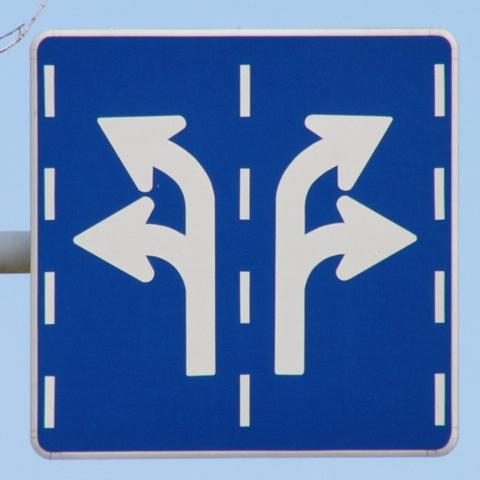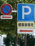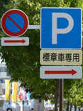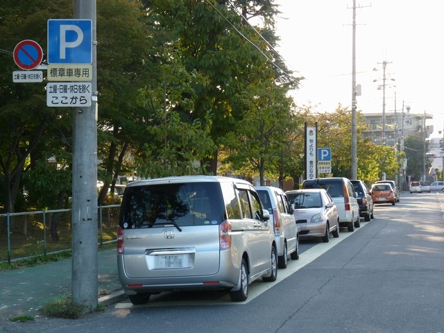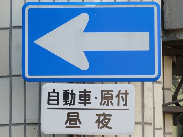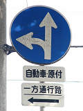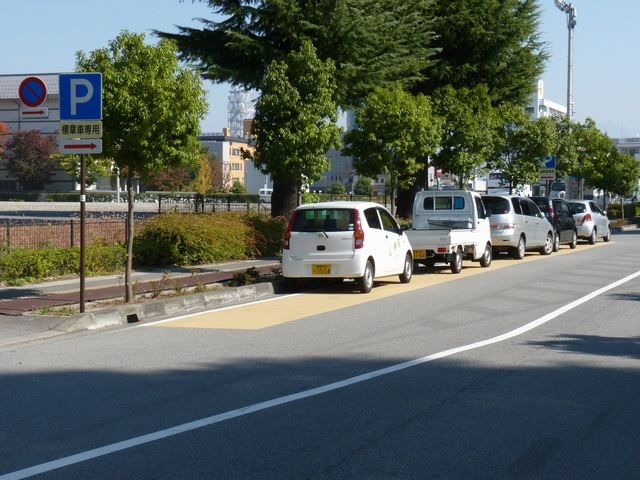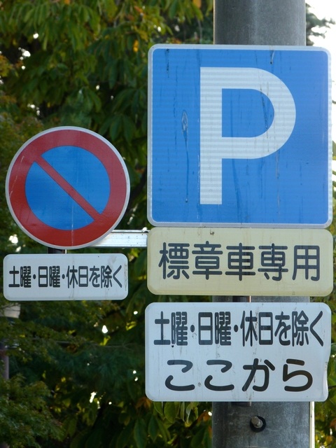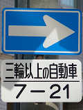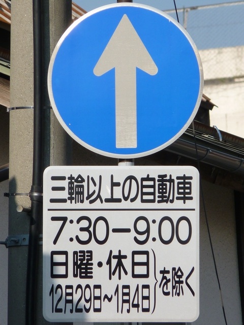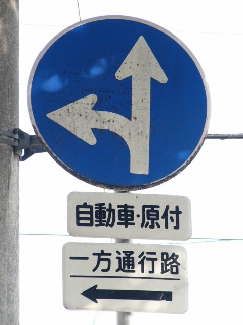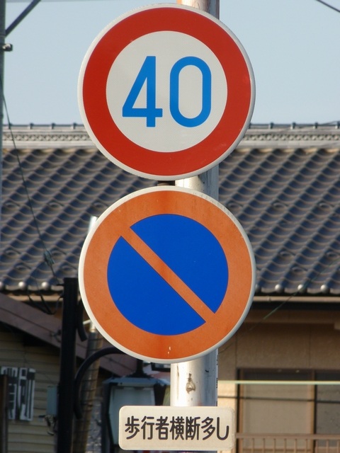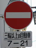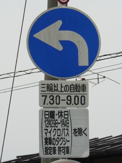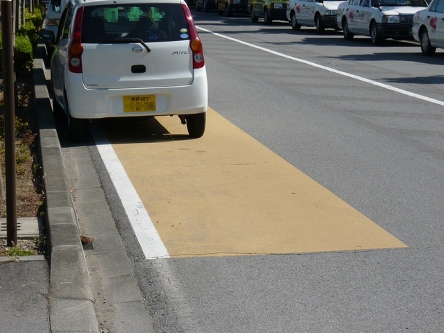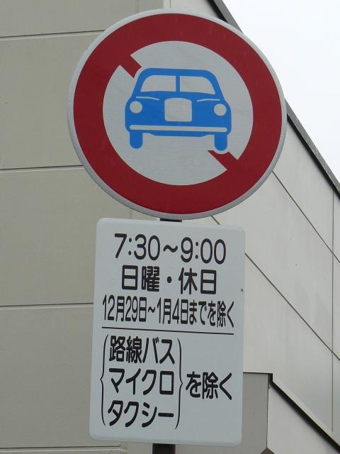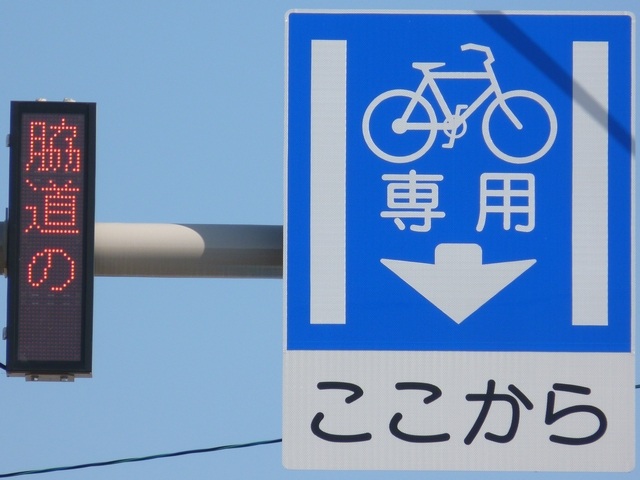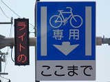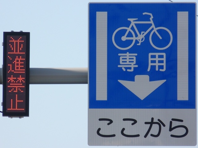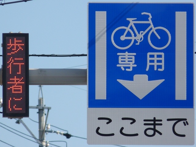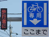 標識の横にはLED式表示板が設置されており、様々な表示が出ますが、この地点でわざわざ表示する必要のない情報も含まれており、情報過多となっています。走行中にはとても読み切れません。 東進始点の表示板・・・ 「ここから・自転車は・専用帯 ・通行↓↓」「自転車は・専用帯を・左側通行」「脇道の ・車に注意」「二人乗り・ 禁止 」「並進禁止」「飲酒運転・ 禁止 」「夜間は ・ライトの・点灯を 」(1サイクル48秒) 東進終点の表示板・・・ 「自転車は・専用帯 ・ 通行 」「 横断 ・歩行者に・ 注意 」「脇道の ・車に注意」「二人乗り・ 禁止 」「並進禁止」「飲酒運転・ 禁止 」「夜間は ・ライトの・点灯を 」(1サイクル46秒) 西進始点の表示板・・・ 「ここから・自転車は・専用帯 ・通行↓↓」「自転車は・専用帯を・左側通行」「この先 ・走行注意」「二人乗り・ 禁止 」「並進禁止」「この先 ・走行注意」(1サイクル40秒) 西進終点の表示板・・・ 「自転車 ・専用帯は・ここまで」「 横断 ・歩行者に ・ 注意 」「二人乗り・ 禁止 」「並進禁止」「飲酒運転・ 禁止 」「夜間は ・ライトの・点灯を 」(1サイクル40秒)