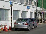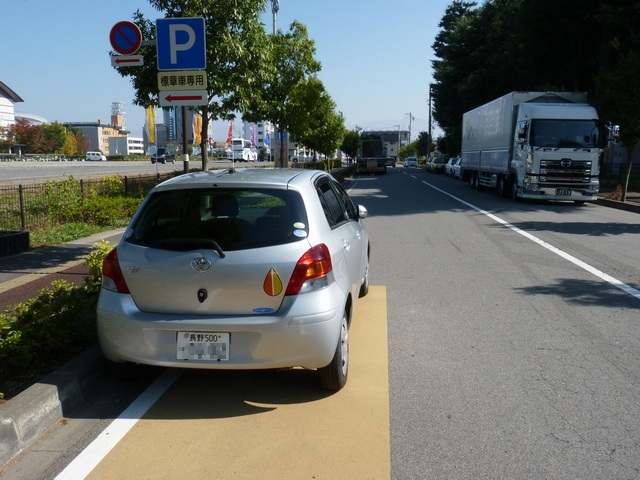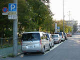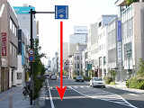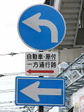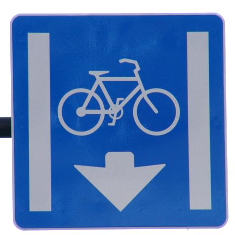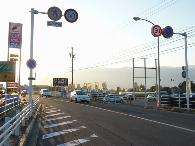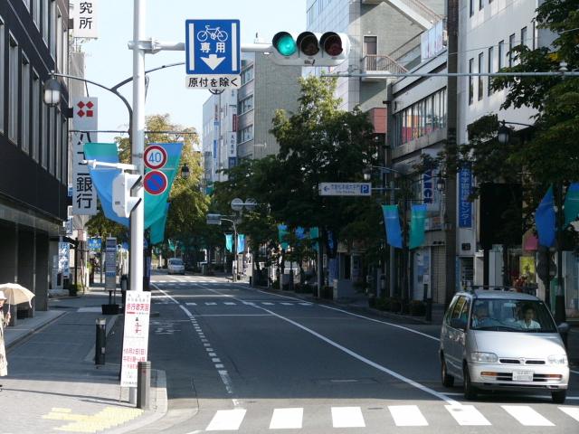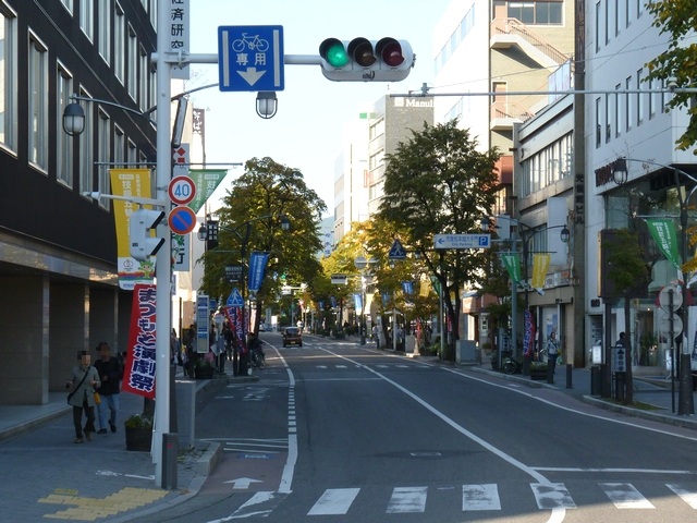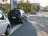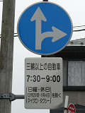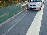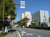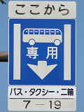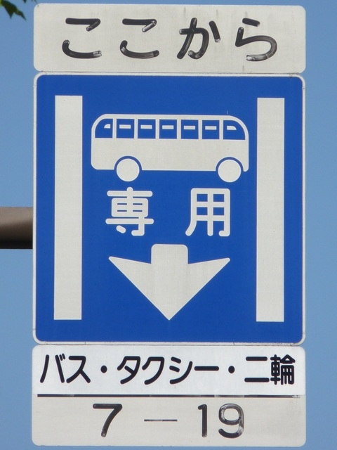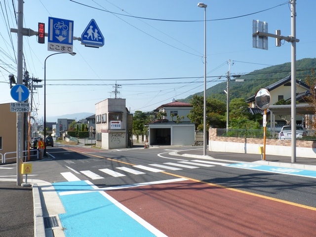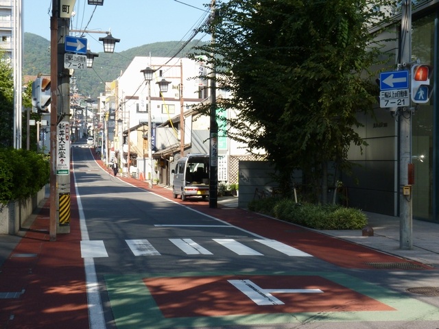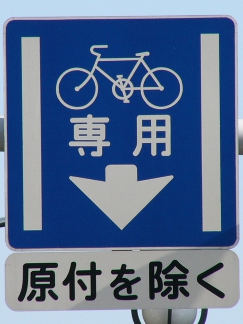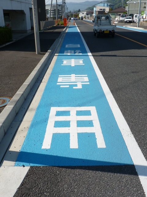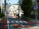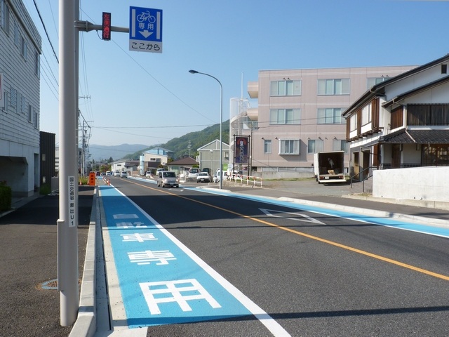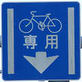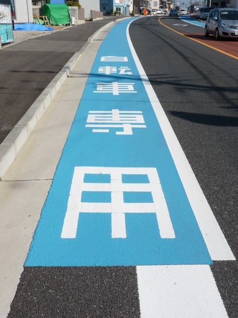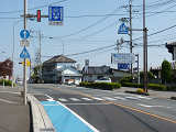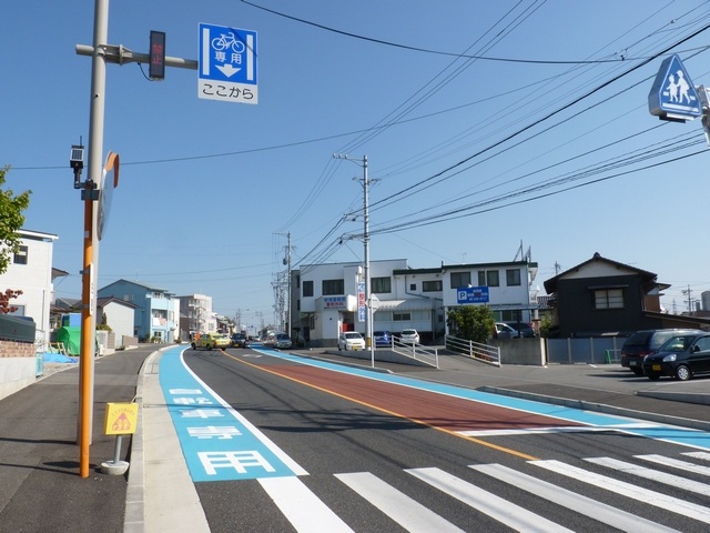 約220mの区間で、第1通行帯が自転車専用通行帯規制されています。標識は、区間の始まりと終わりに設置されています。道路標示は、区間の始まりに設置されています。警察庁の通達では路面を塗装する場合は青系の色となっているので、青色となっています。
