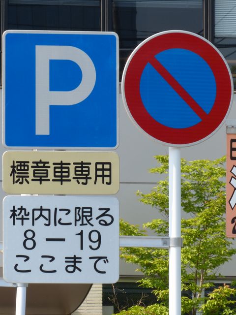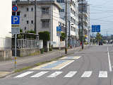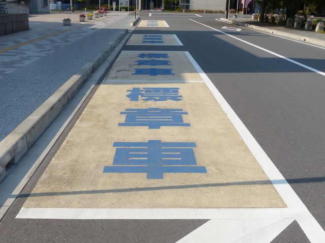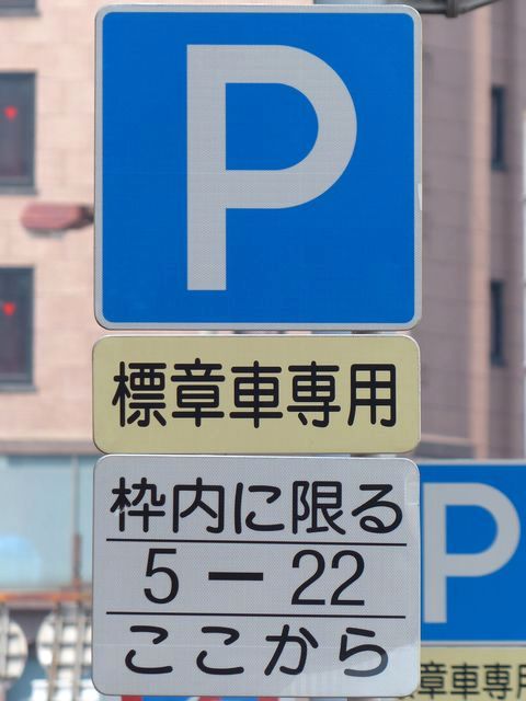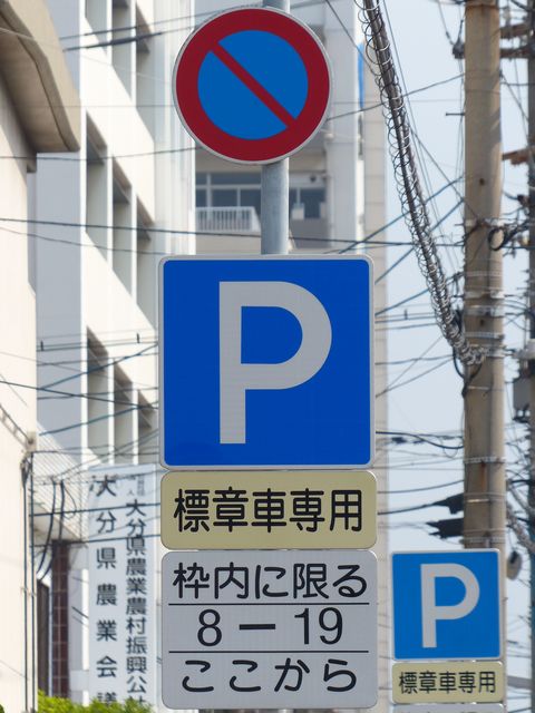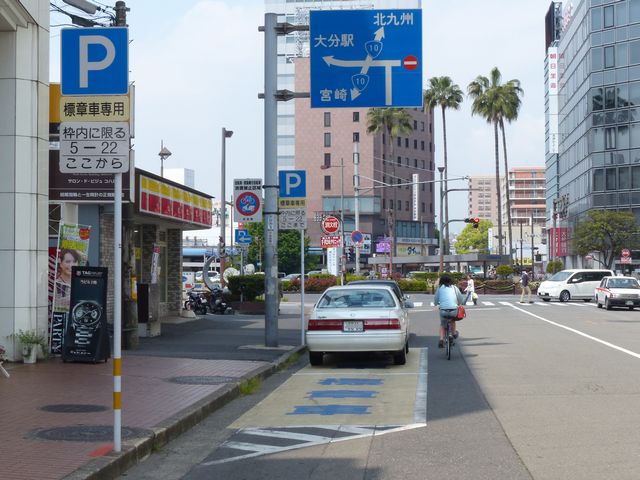 大分駅前の片側1車線の道路に設置されています。指示時間は5時から22時までとなっています。区間内には2台分の「平行駐車」道路標示が設置されています。駐車枠内は、淡い黄色のカラー舗装に青色の「標章車」の法定外表示が設置されています。