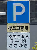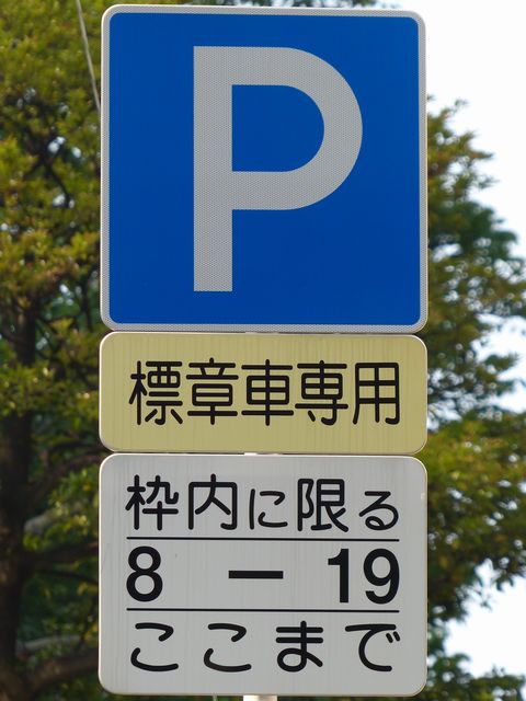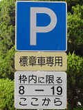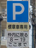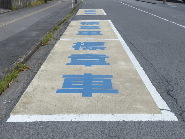 県営住宅脇の片側1車線の道路に設置されています。指示時間は8時から19時までとなっています。区間内には3台分の「平行駐車」道路標示が設置されています。駐車枠内は、淡い黄色のカラー舗装に青色の「標章車」の法定外表示が設置されています。