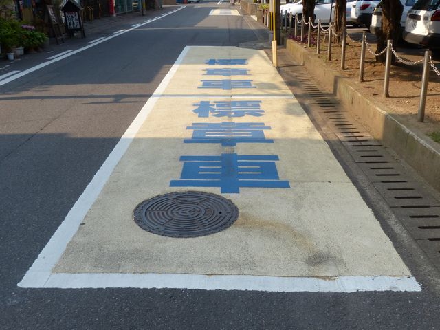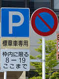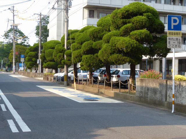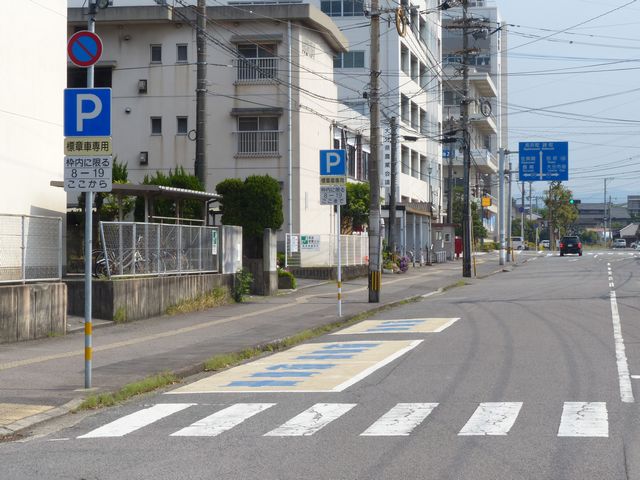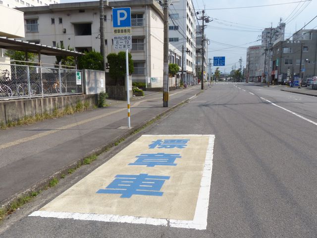 県庁別館脇の1.5車線の一方通行路(軽車両を除く)右側に設置されています。指示時間は8時から19時までとなっています。区間内には4台分の「平行駐車」道路標示が設置されています。駐車枠内は、淡い黄色のカラー舗装に青色の「標章車」の法定外表示が設置されています。