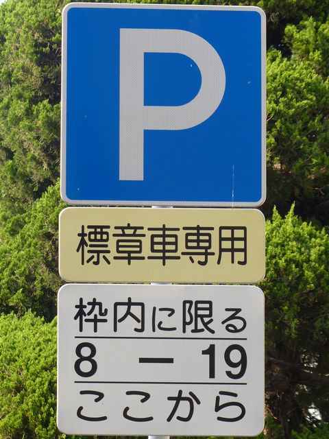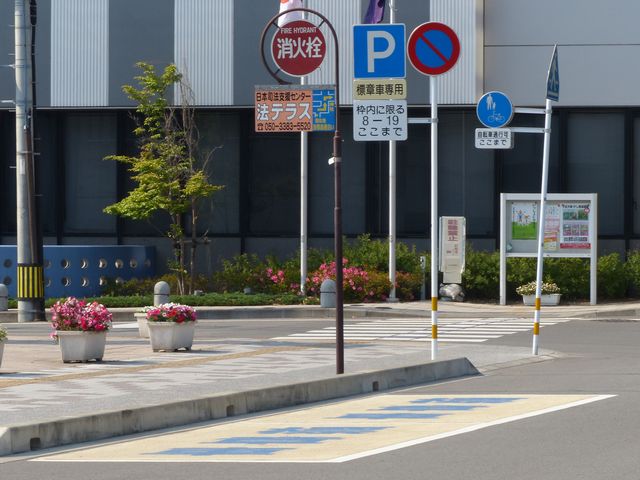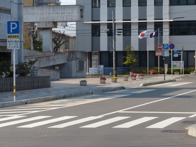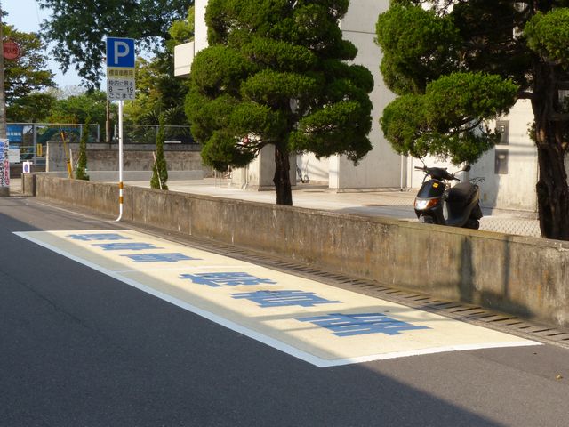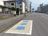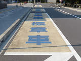 芸術文化施設前の片側1車線の道路に設置されています。指示時間は8時から19時までとなっています。区間内には5台分の「平行駐車」道路標示が設置されています。駐車枠内は、淡い黄色のカラー舗装に青色の「標章車」の法定外表示が設置されています。