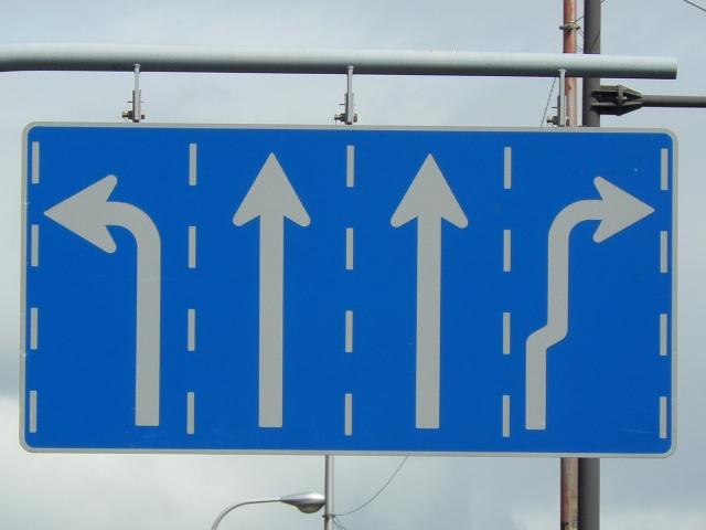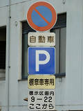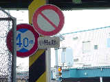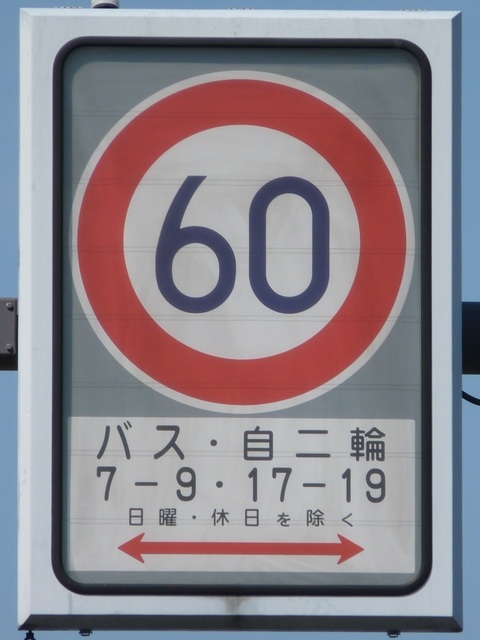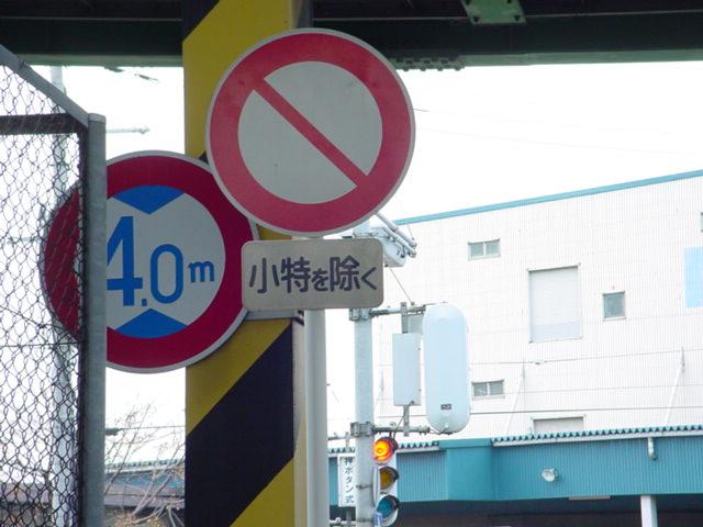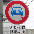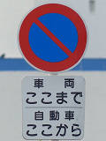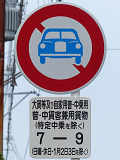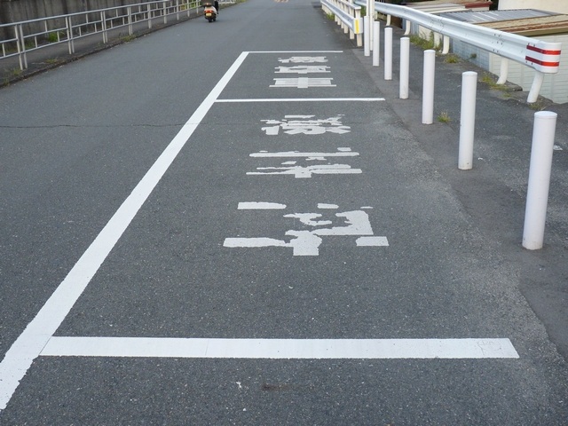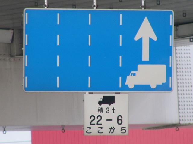 本当ならば、車両通行帯の破線がトラックのイラストの上までですが、これは標識下まで描かれています。 |