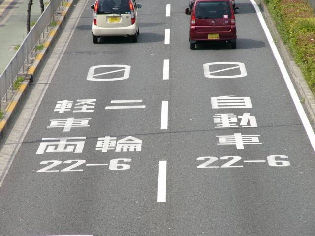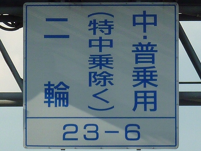 特定中乗を除く中乗と普乗は、当然、乗用でもあるので、どちらの通行帯も通行することができます。 法令改正により中型区分が新設されるまでは、標識の「中・普乗用(特中乗除く)・二輪」は「普通乗用・二輪」と表示されていました。 同様の規制が阪神高速守口線や堺線でも行われています。