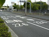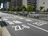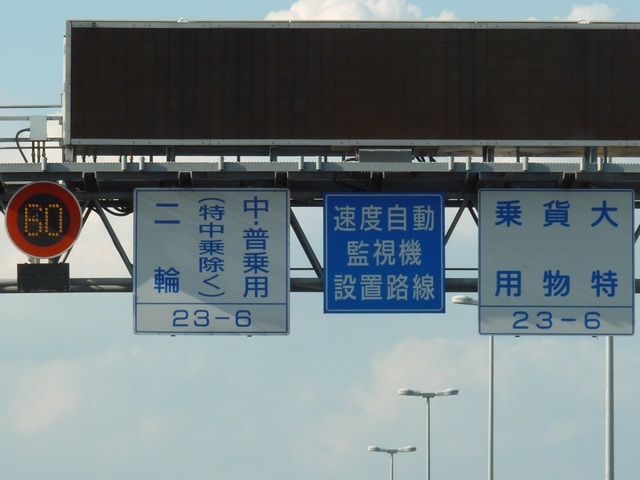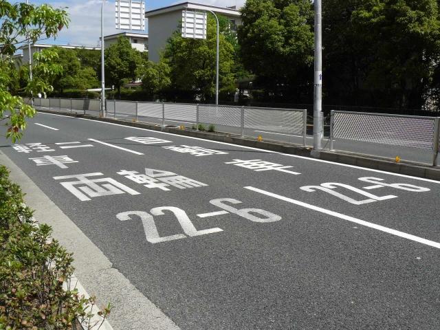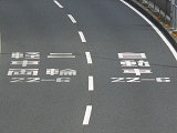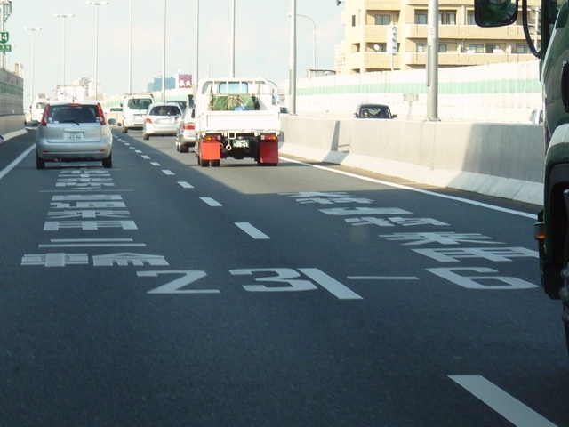 阪神高速の一部路線の一部区間では、深夜から早朝かけて車両通行区分規制が行われています。標識では、第1通行帯は「中・普乗用(特中乗除く)・二輪」、第2通行帯は「大特・貨物・乗用」となっています。「中・普乗用」や「特中乗」は、法令では定められていない略称です。おそらく「中・普乗用」は「中乗・普乗」、そして「特中乗」は「特定中乗」のことを言いたいのでしょう。道路標示では、第2通行帯は同じですが、第1通行帯は「中乗(特中乗除く) 普通乗用 二輪」となっています。