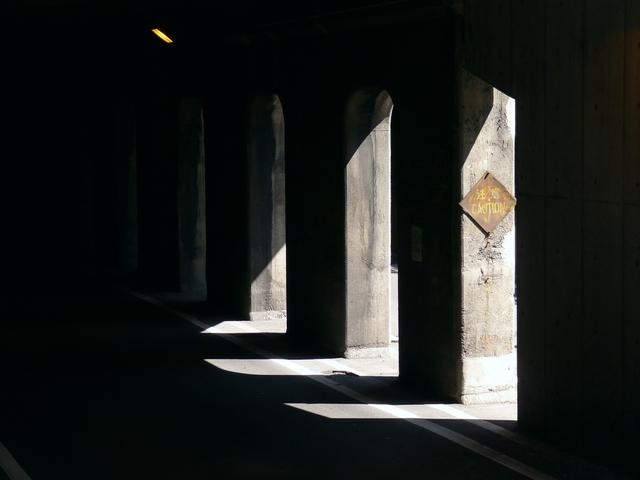 アーケードの柱に旧型標識と同じ様式の標識のようなものが設置されています。両面表示となっている点や、補助標識が一体化している点、補助標識の表示内容から、正規の道路標識ではないようです。