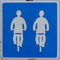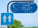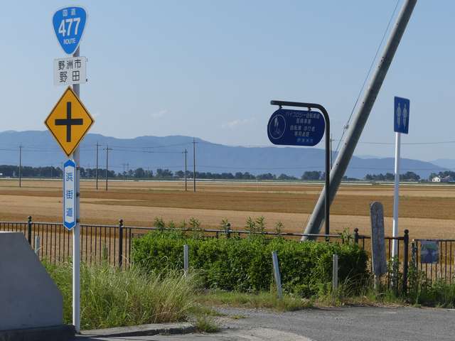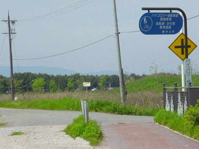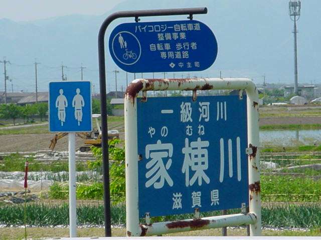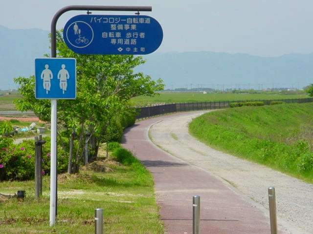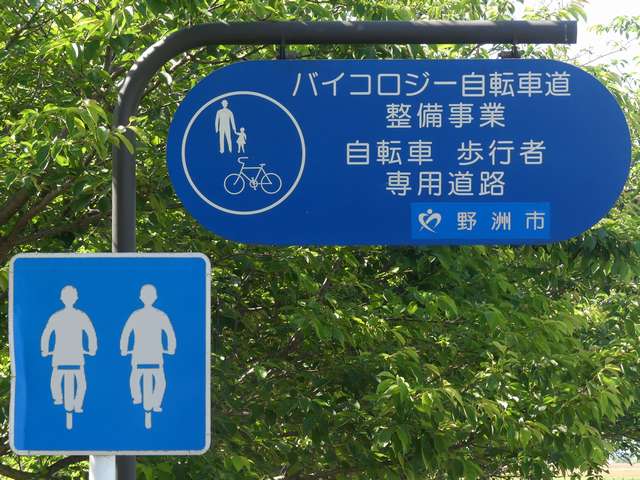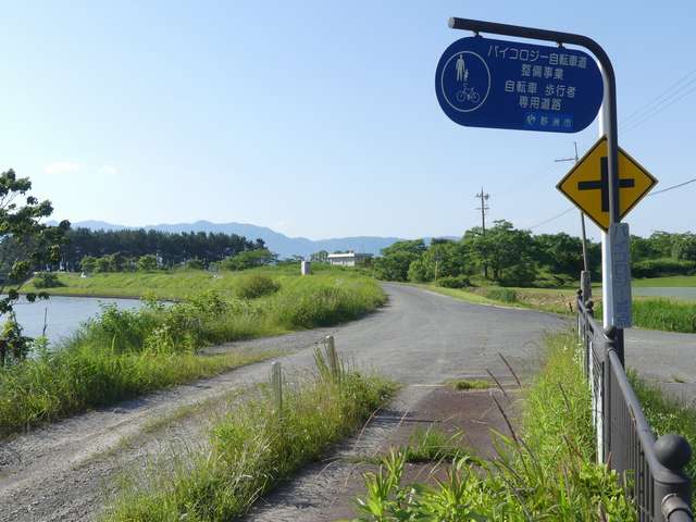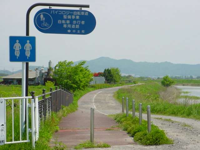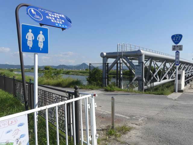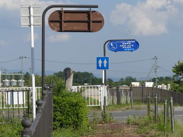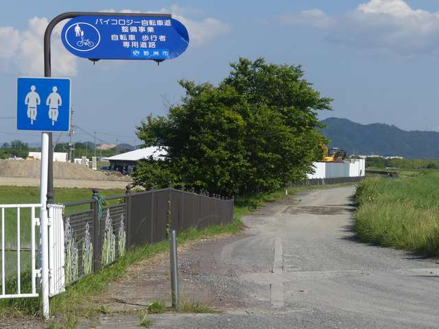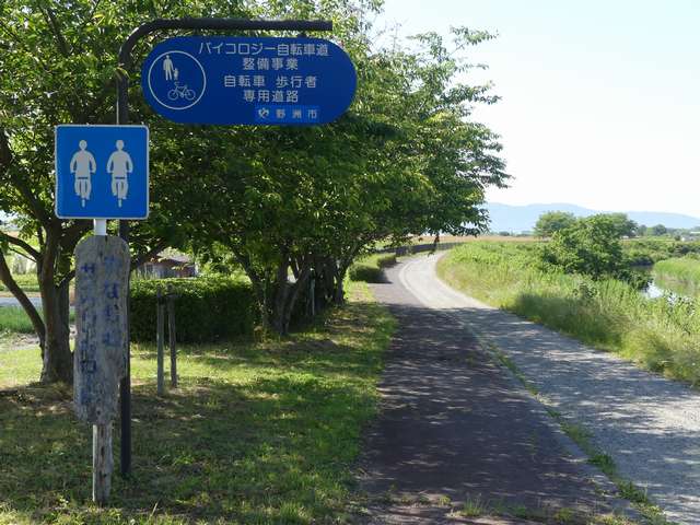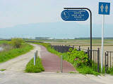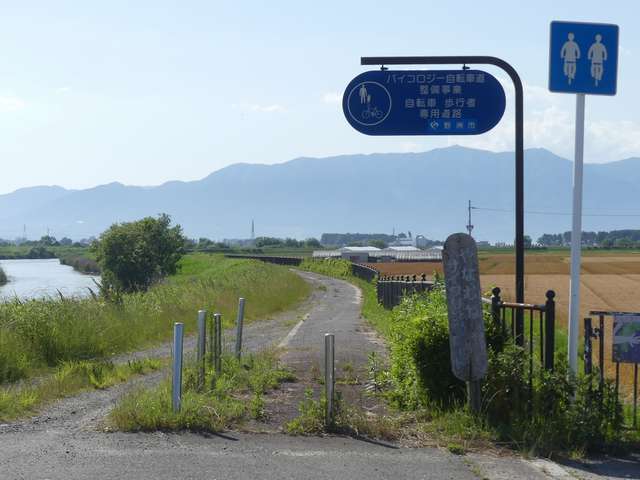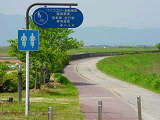 滋賀r48比留田橋(家棟川)の西詰から川沿いを北西に進み、R477野田橋の北詰を経由して、さらに川沿いを北に進む約3.5kmのバイコロジー自転車道「やなむねサイクリングロード」で「並進可」の指定が行われていました。 「並進可」の指定は区間で行うものなので、本来は必ず区間の始まりと終わりの標識が必要ですが、ここでは区間の入り口と思われる箇所3か所に本標識のみが設置されているだけでした。また、標識のウラ面には県公安委員会のラベルが貼られておらず、公安委員会の意思決定を受け、県警察が設置したものかどうかわかりませんでした。 道路を見ると、臙脂色のカラー舗装の部分と未舗装の部分があり、カラー舗装の部分だけに車止めの杭があることから、そこだけが自転車道という扱いのようです。自転車道の管理者である野洲市が設置した看板には「自転車・歩行者専用道路」の表示があり、「自転車及び歩行者専用」標識も描かれていますが、同標識そのものの設置はなく、自転車以外の車両の通行禁止について法的効力があるのか疑問です。 なお、愛媛県の「並進可」標識が平成30年5月にすべて撤去されましたが、その後こちら滋賀県の「並進可」標識も同年度中にすべて撤去されました。愛媛県の「並進可」標識が撤去されたことにより、全国唯一となったこちら滋賀県の「並進可」標識に注目が集まったものの、実は公安委員会の決定を受けずに勝手に設置された標識であったため、ひっそりと撤去された可能性があります。 画像は、滋賀r48比留田橋の西詰から北西を見たものです。