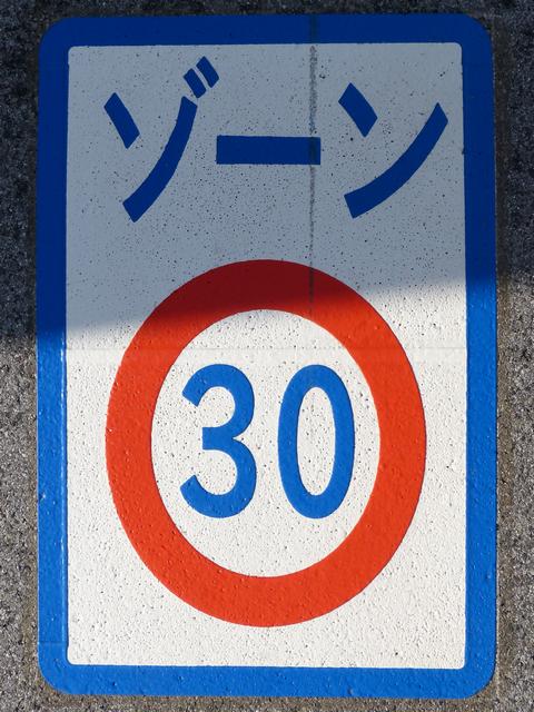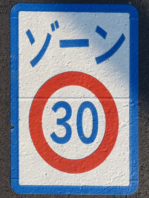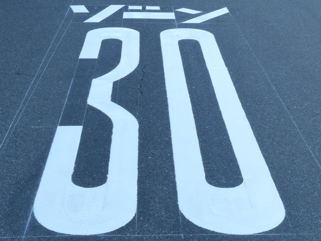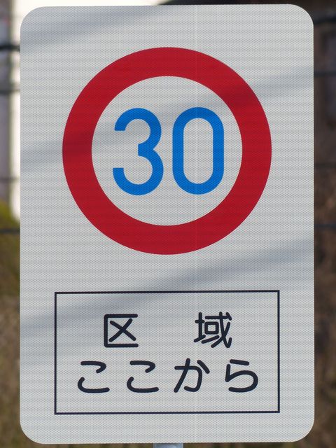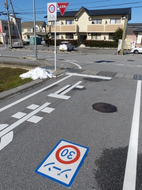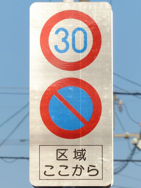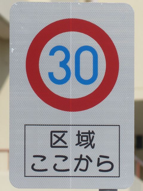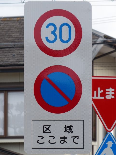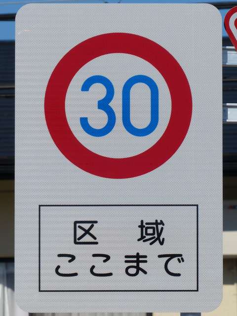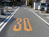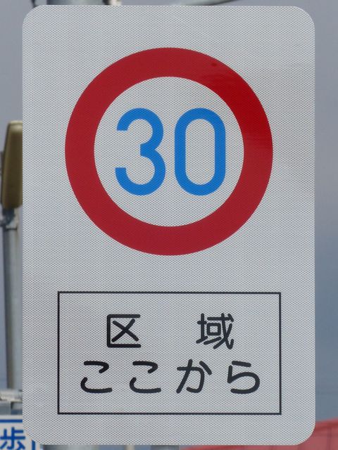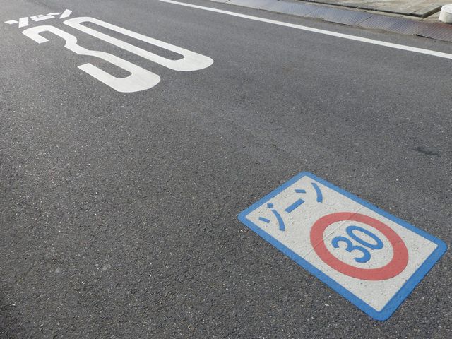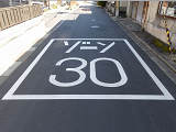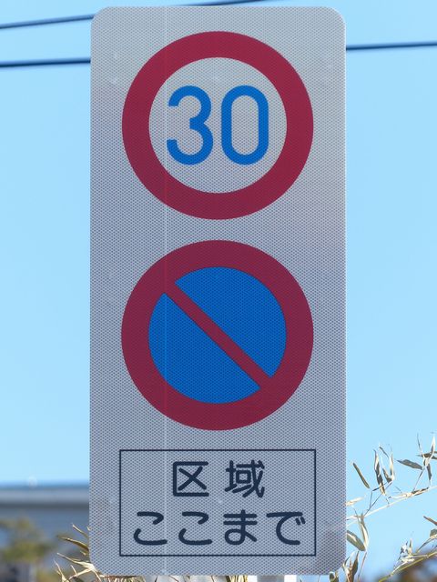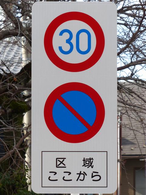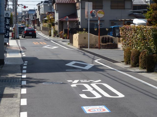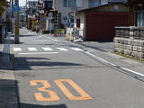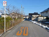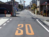 区域の入口と出口に背板一体の「最高速度」標識と「駐車禁止」標識が設置されています。最高速度規制については区域内に標識は設置されていませんが、道路標示の「最高速度」が設置されています。駐車禁止規制については、既設の「駐車禁止」標識(区間内のため補助標識なし)に「区域内」の補助標識を追加しています。 区域の入口の路面には、「ゾーン30」のシートが貼られています。しかし、シートが小さく、ドライバー目線では見落としてしまいそうです。 ゾーン30の実施では、最高速度規制のほか、路側帯の拡幅や歩行者専用路側帯化、中央線の抹消などが行われています。 なお、後から区域の入口に「ゾーン30」の法定外表示2種類が追加されています。