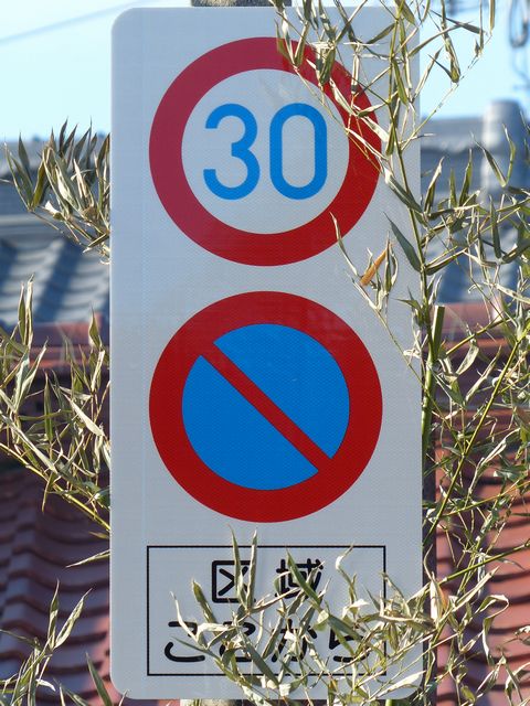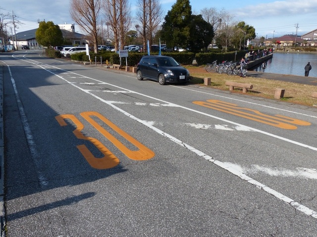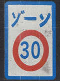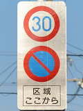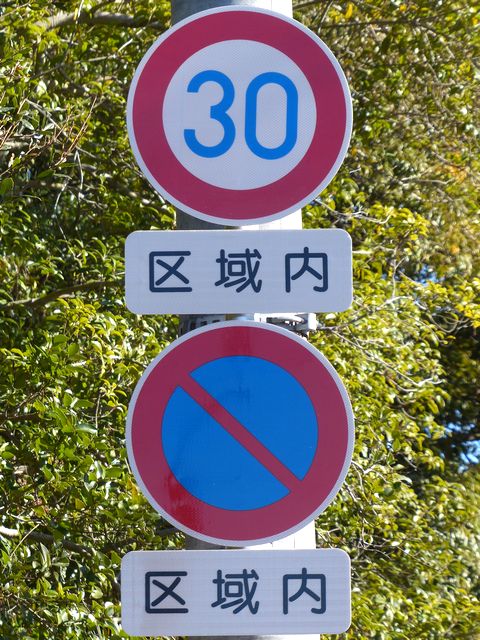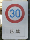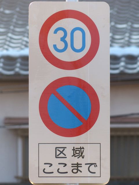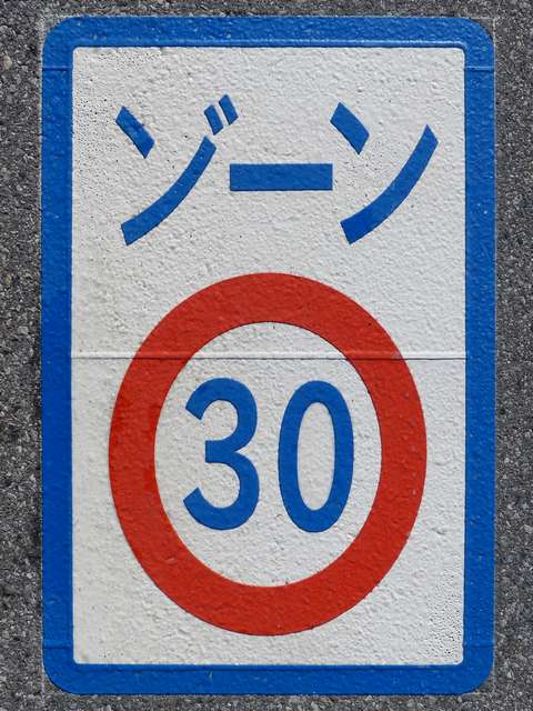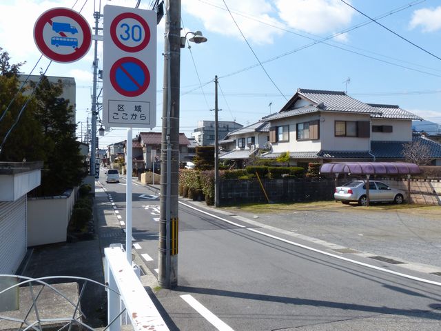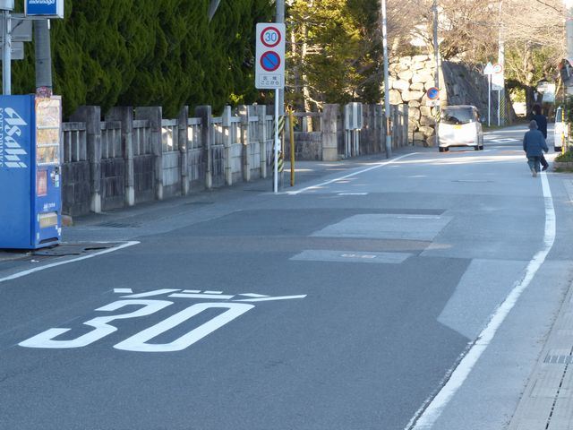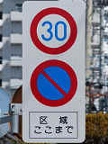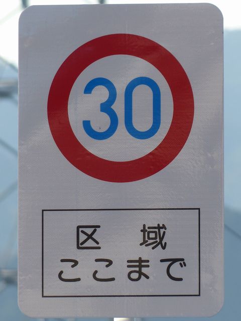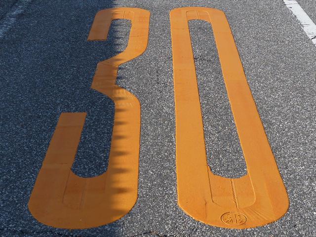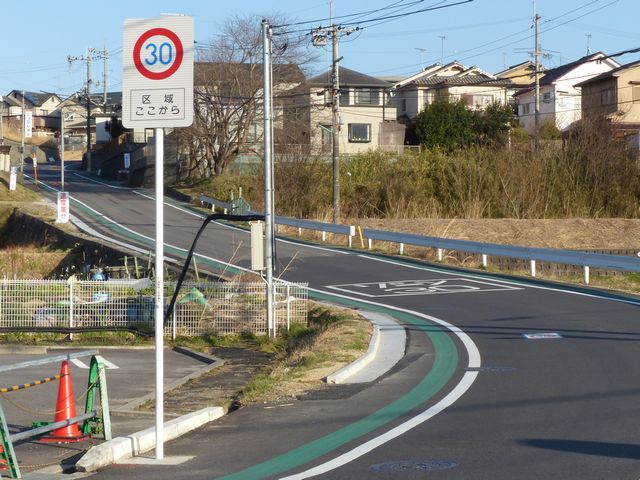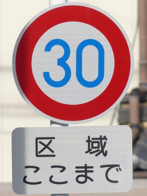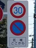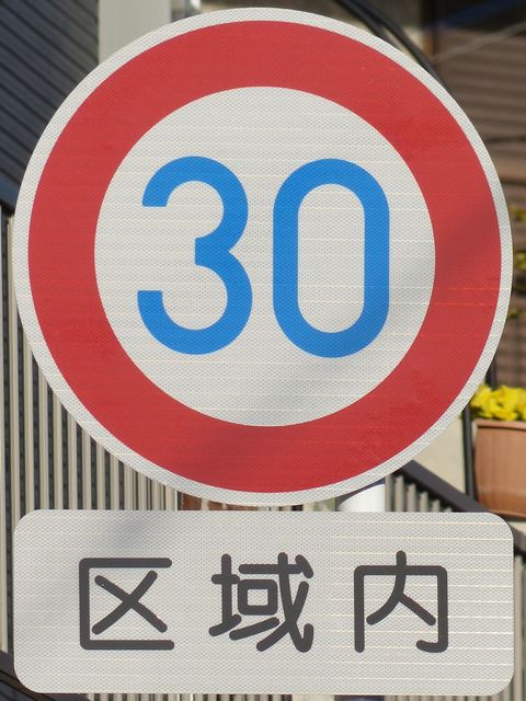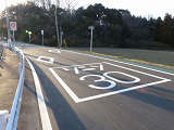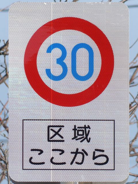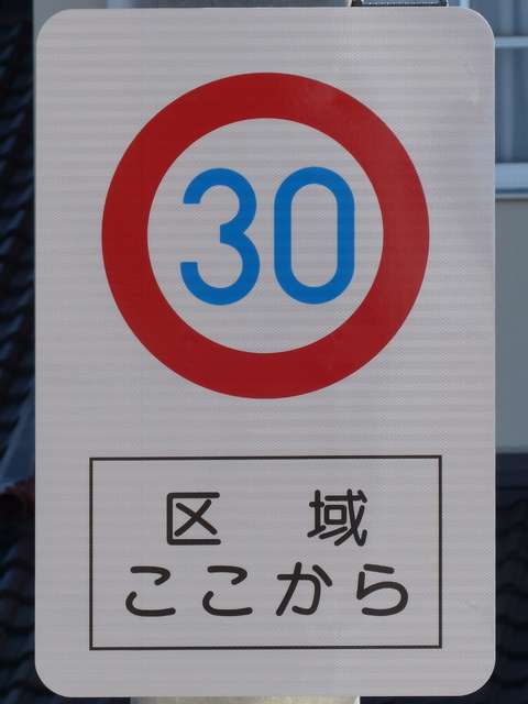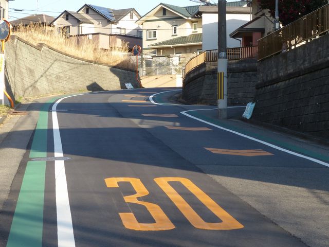区域の入口と出口に背板一体の「最高速度」標識と「駐車禁止」標識が設置されています。最高速度規制については区域内に標識は設置されていませんが、道路標示の「最高速度」が設置されています。駐車禁止規制については、既設の「駐車禁止」標識(区間内のため補助標識なし)に「区域内」の補助標識を追加しています。 区域の入口の路面には、「ゾーン30」のシートが貼られています。しかし、シートが小さく、ドライバー目線では見落としてしまいそうです。 ゾーン30の実施では、最高速度規制のほか、路側帯の拡幅や歩行者専用路側帯化、中央線の抹消などが行われています。 なお、後から区域の入口に「ゾーン30」の法定外表示2種類が追加されています。