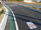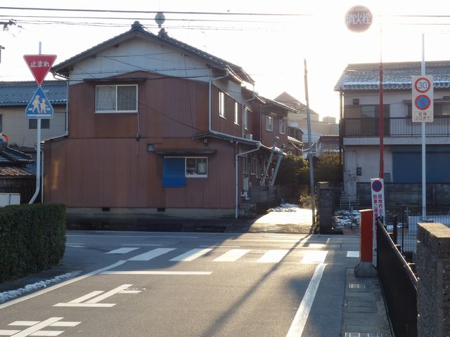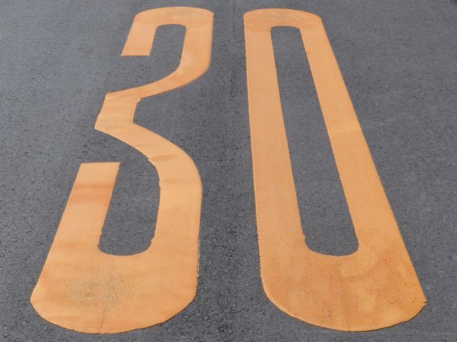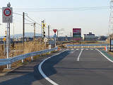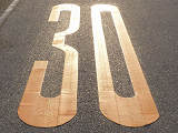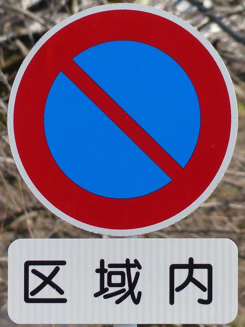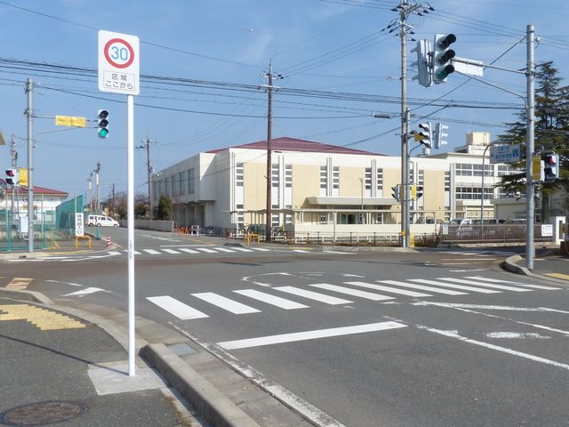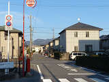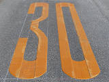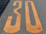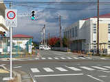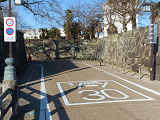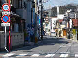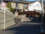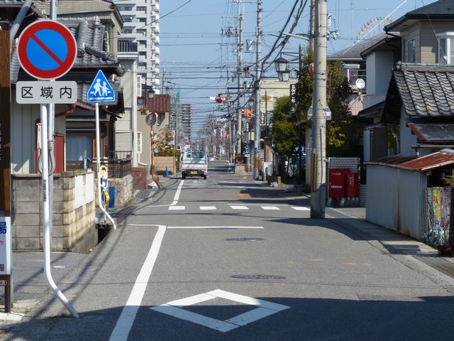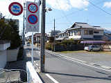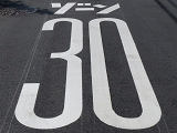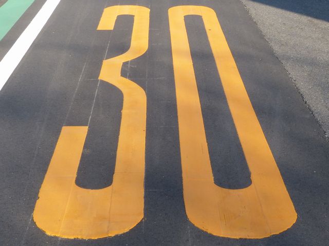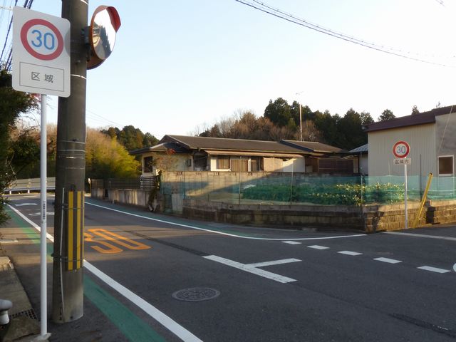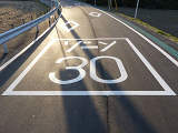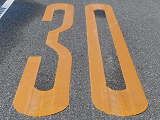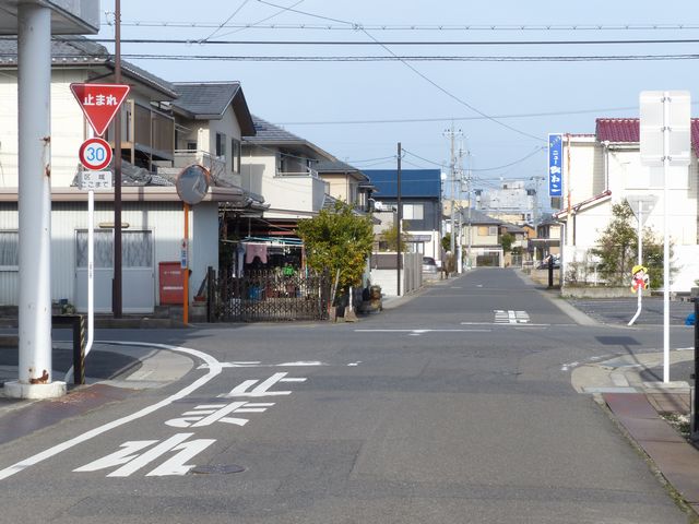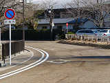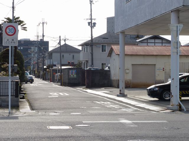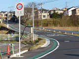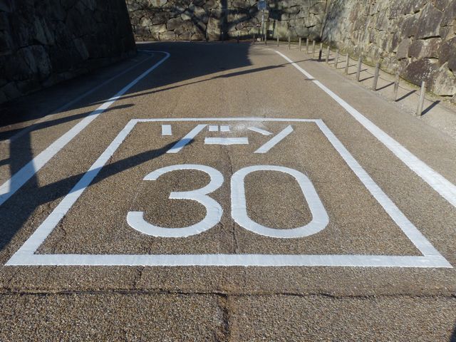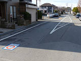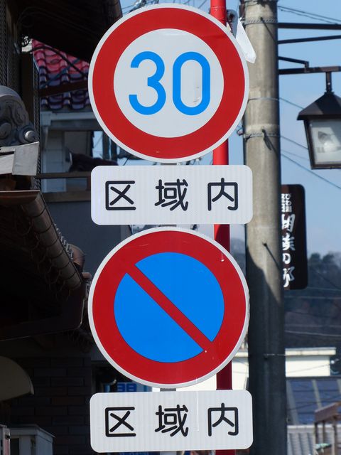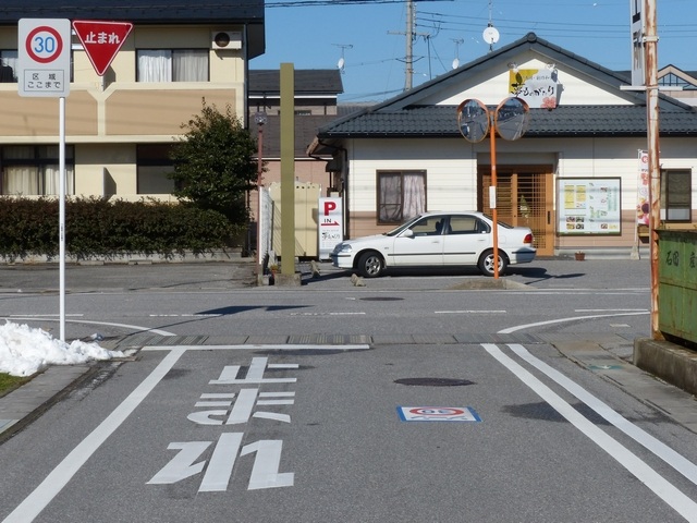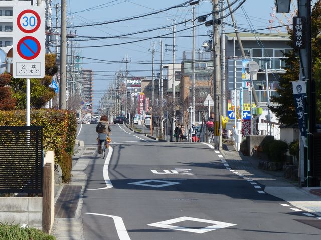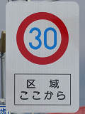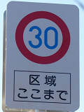 区域の入口と出口に背板一体の「最高速度」標識と「駐車禁止」標識が設置されています。最高速度規制については区域内に標識は設置されていませんが、道路標示の「最高速度」が設置されています。駐車禁止規制については、既設の「駐車禁止」標識(区間内のため補助標識なし)に「区域内」の補助標識を追加しています。 区域の入口の路面には、「ゾーン30」のシートが貼られています。しかし、シートが小さく、ドライバー目線では見落としてしまいそうです。 ゾーン30の実施では、最高速度規制のほか、路側帯の拡幅や歩行者専用路側帯化、中央線の抹消などが行われています。 なお、後から区域の入口に「ゾーン30」の法定外表示2種類が追加されています。