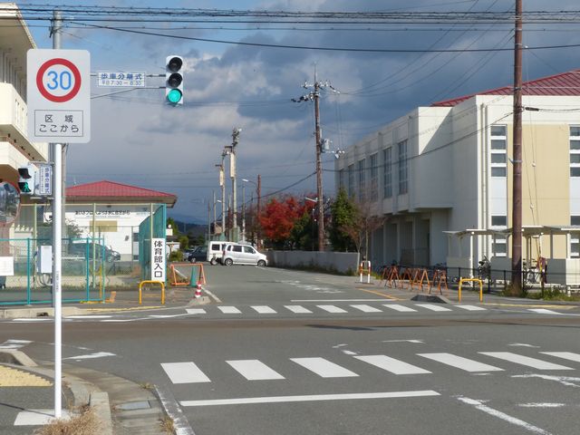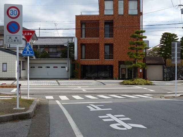 警察庁のゾーン30推進により2012年12月に滋賀県内7か所でゾーン30規制が実施されました。こちらは、そのうち彦根市で整備されたものです。彦根城の中堀以内の区域では、以前に「城内全域」として最高速度30キロ規制が実施されていましたが、その区域と、その区域から幹線道路に接続するまでの区間、また隣接する市民会館や図書館のある生活道路一帯がゾーン30規制の対象となりました。ゾーン30規制の実施により「城内全域」の最高速度規制は廃止されました。