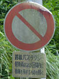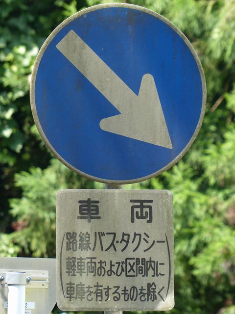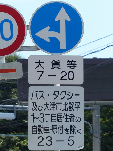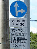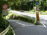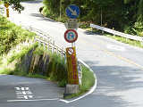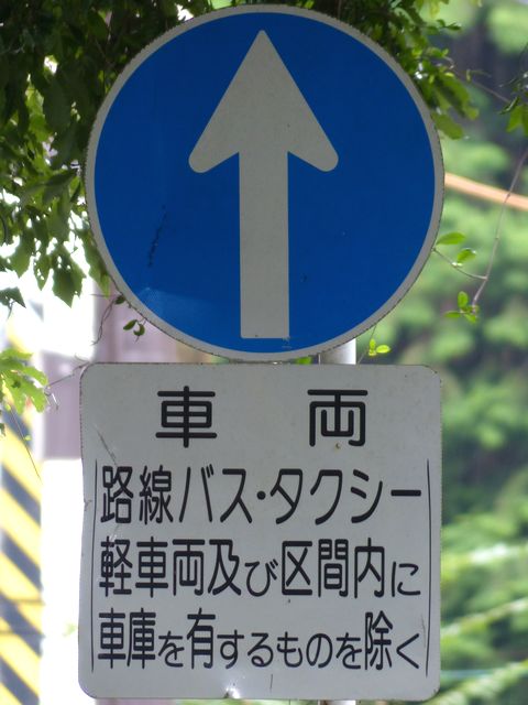 東側入口の分岐は、旧道と現道がほぼ平行に伸びているため、「指定方向外進行禁止」標識は矢印が右下を指すもの(標識の左側が通行できないことを示すもの)が設置されています。公安委員会の設置では、珍しい標識です。 補助標識の表現が統一されておらず、一部では「路線バス・タクシー・軽車両及び区域内に自動車の車庫を有するものを除く」となっており、区間内居住者でも、原付や軽車両では通行できないかのような表示となっています。