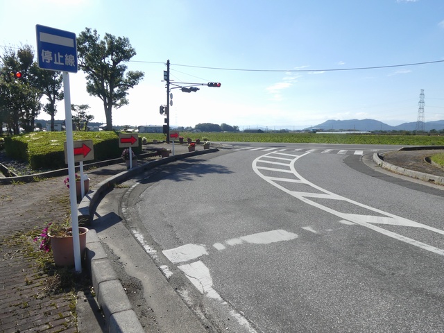 交差点の手前が急カーブとなっており停止線を下げているので、それを強調するために「停止線」標識を設置しています。