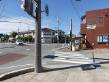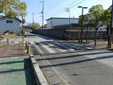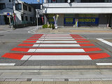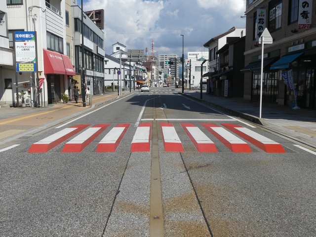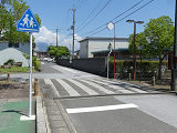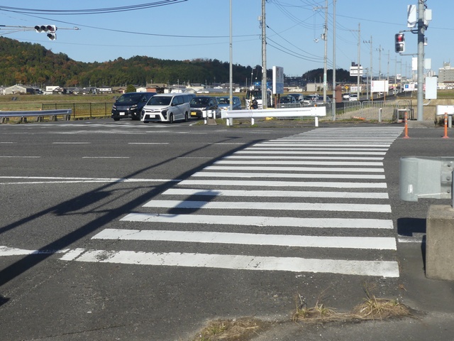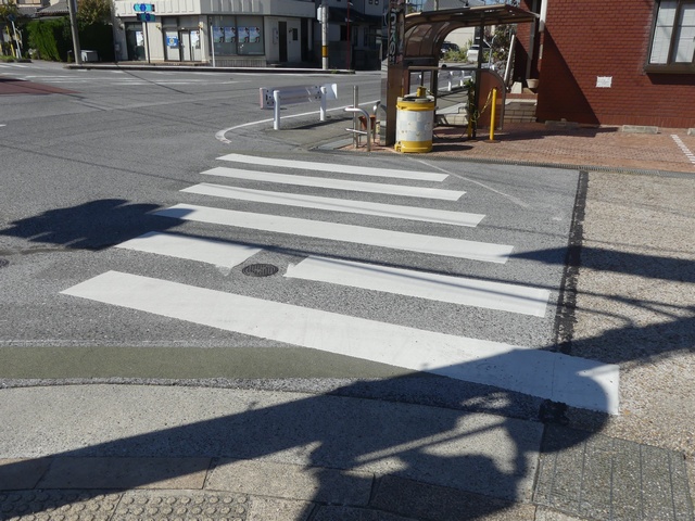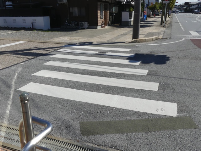 横断歩道を道路に対して斜めに設置する場合、県内のほかの場所では白線の側辺の延長が直線でつながるように白線を平行四辺形にしますが、ここでは白線を長方形にしています。なお、『交通規制基準(警察庁)』で例示されているのは、このタイプです。