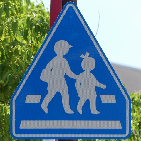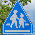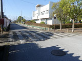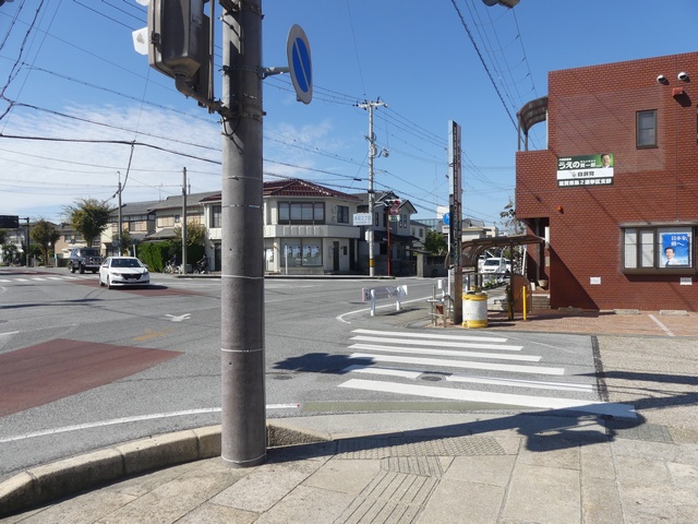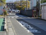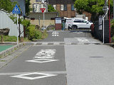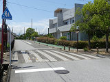 遊歩道と道路が交差する箇所で、インターロッキングブロックで路面に横断歩道が描かれていますが、「横断歩道」標識やダイヤマーク、停止線が設置されていませんでした。小学校のすぐ近くで、児童の横断に対する注意喚起の法定外表示や看板は設置されていました。県公安委員会の決定を受ける見込みで横断歩道を描いたものの、決定が受けられなかったのでしょうか? 路面の横断歩道は1982年にはすでに描かれていたようです。