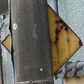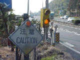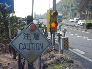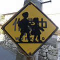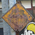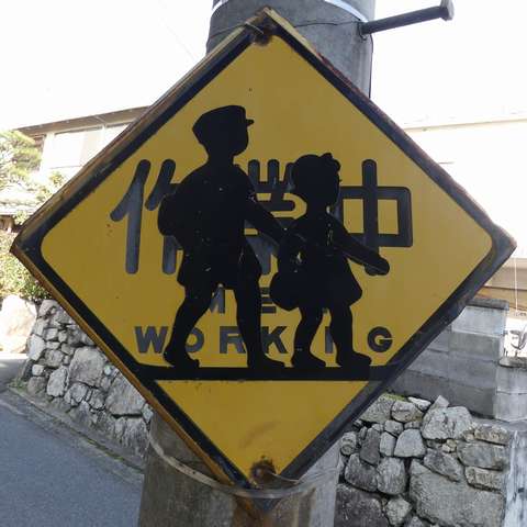 昭和38年7月に制定され昭和46年11月に廃止(「工事中」標識と「道路工事中」標識に統合)された標識です。現在の「道路工事中」標識と同様に道路で作業を行う際に一時的に設置された標識であるため、残る可能性が極めて低い標識ですが、「学校、幼稚園、保育所等あり」標識として再利用されているため残っています。