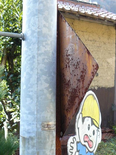 一般の家の敷地内にあり、もとから私有物だったそうですが、作りが本物の道路標識と同じように見え、家の人によると「昭和30年代からあった」そうなので、特別に掲載します。