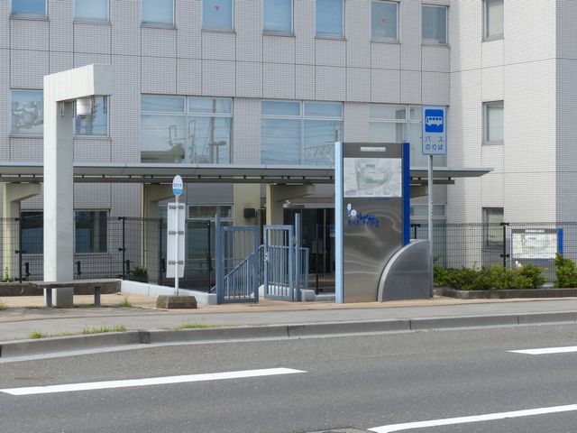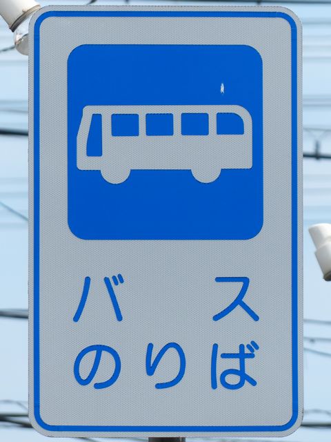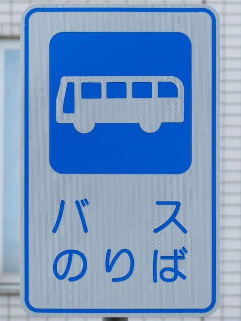 バス乗り場を案内する歩行者向けの案内標識です。交通量の多い道路で歩行者の横断が困難であり、対向側の歩道からバス乗り場へ行く場合、道路の下をくぐる必要がありますが、その際最短ルートで行けるように、対向側歩道からバス乗り場の概ねの位置が分かりやすいように設置しているようです。