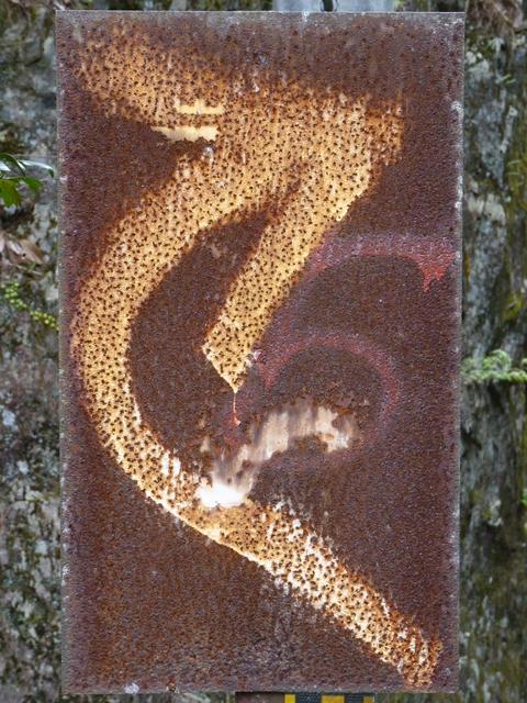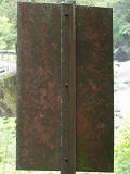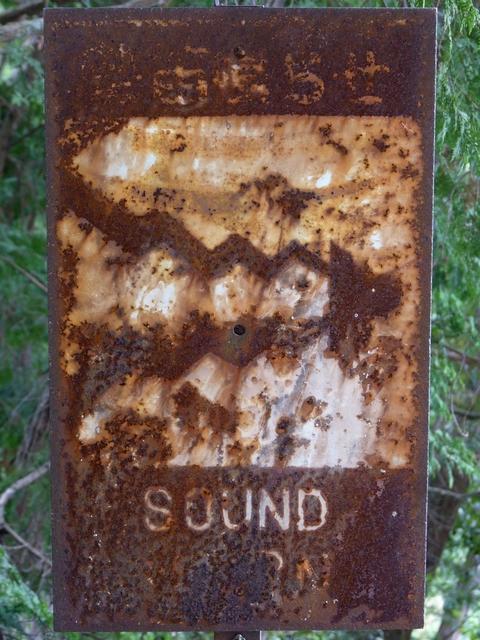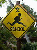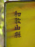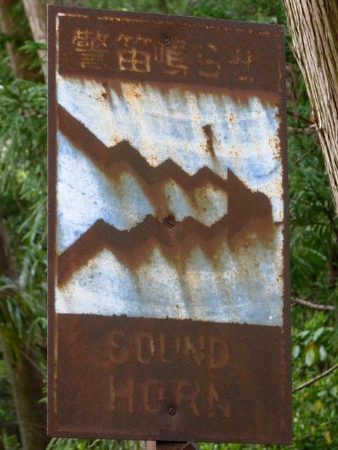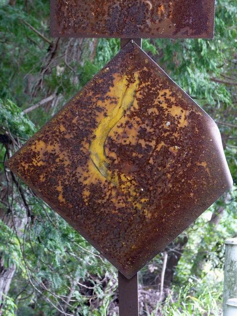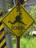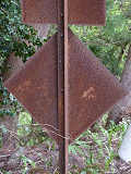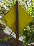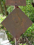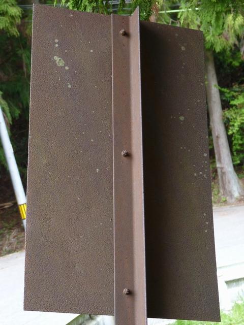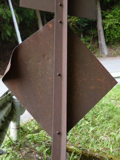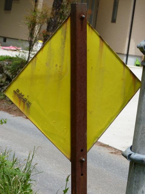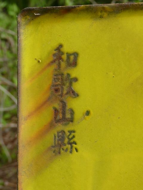 標識板は1辺45cmであり、法令で定められた大きさです。地面から標識板までは103cmです(南進側)。標識板の裏には設置者を表す「和歌山縣」の刻印があります。ネジ止め部分以外に目立った錆は見られず、非常に状態がよいです。南進のものは、小学生の顔の部分が白くなっていますが、何かシールのようなものを悪戯で貼られているようです。北進のものは、道路に倒れかけていますが、これ以上倒れないようにフェンスから番線で吊られています。