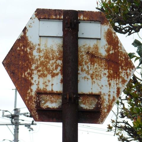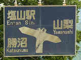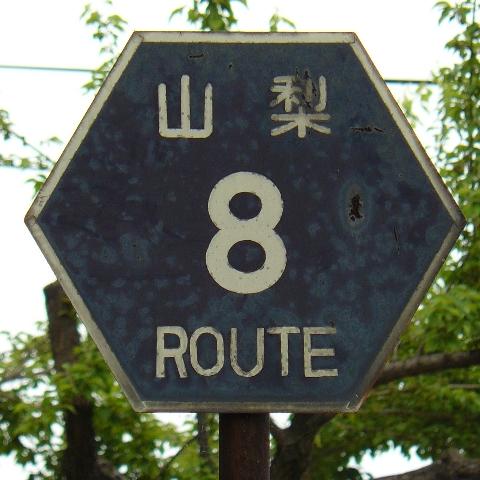 現行の「都道府県道」標識は上に「県道」、下に県名が書かれているのに対し、これは上に県名、下に「ROUTE」と書かれています。まだ「都道府県道」標識が制定されていない頃に「国道番号」標識を参考にして山梨県独自で使用していたものだと思われます。なお、補助標識が設置されていた形跡があります。現在、山梨県道8号は欠番になっており、この県道には別の番号が割り振られています。