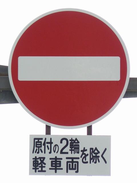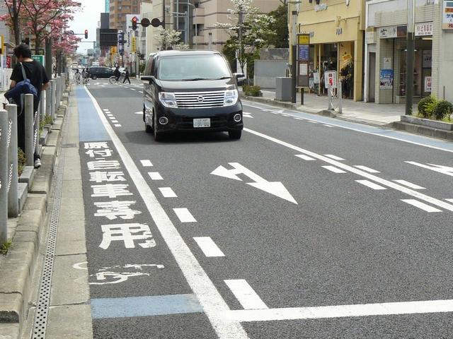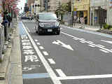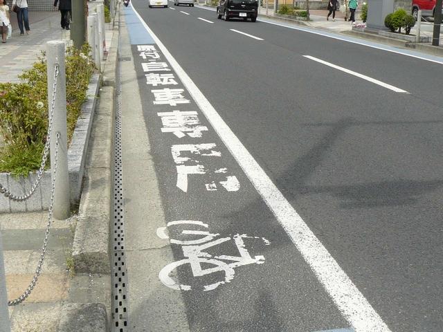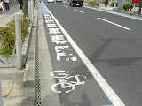 「原付・自転車専用」の「専用通行帯」標示がありますが、標識は設置されていません。なお、自転車の記号が描かれていますが、自転車の記号は「普通自転車歩道通行可」「普通自転車の歩道通行部分」「自転車横断帯」を表すものであり「専用通行帯」に使用するのは誤りではないでしょうか。