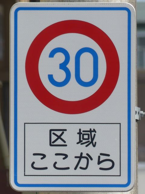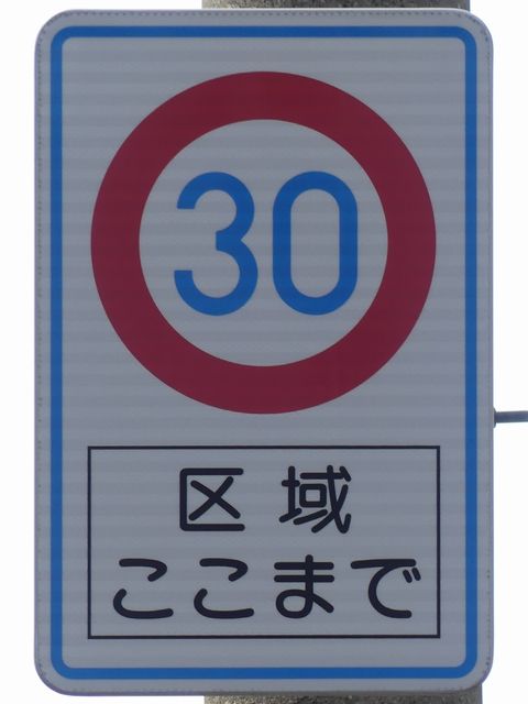 区域の出入口に背板一体の「最高速度」標識が設置されていますが、なぜか背板に「規制予告」(409-A)標識のような縁取りがあります。区域内については、背板のない「最高速度」標識が設置されていますが、本来は「区域内」の補助標識が必要です。