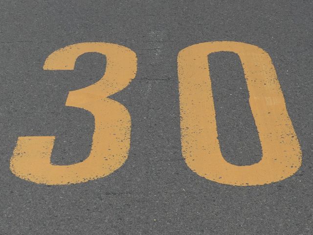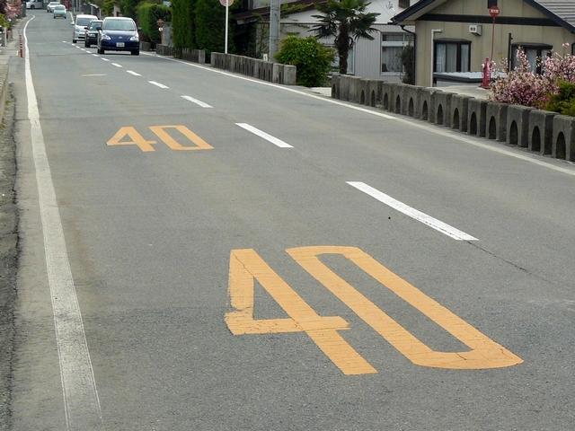 区域の入口に道路標示「最高速度」が設置されていますが、通常のものより小さいです。