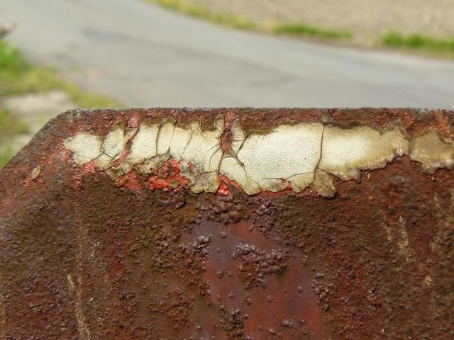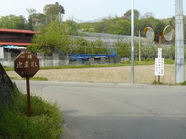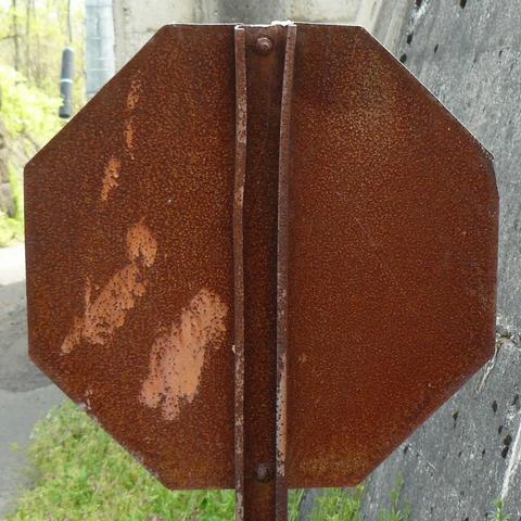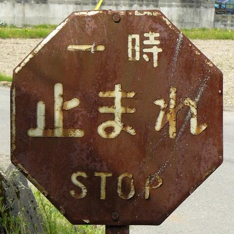 昭和35年12月から昭和38年3月まで使用された8角形の規制標識「一時停止」です。文字と縁以外の部分は完全に錆びていますが、縁の白色が剥げている部分に鮮やかな赤色が見えます。標識板は一辺23cmであり、法令で定められた大きさです。地面から標識板までの高さは約92cmです。裏面や標識柱も錆びていて、設置者名は確認できません。