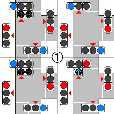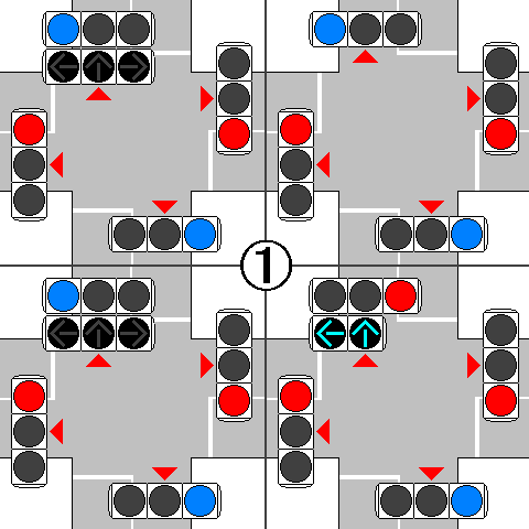 通常青信号方式 歩行者が押ボタンを押しても主道路の信号には変化がない。従道路にも信号機がある場合は、従道路の信号は感応式となっている場合が多い。 |