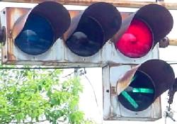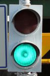 青色の灯火 歩行者は進むことができます。 車両(軽車両を除く)、路面電車は直進、左折、右折することができます。ただし、二段階の右折方法により右折する原動機付自転車は、右折する地点まで直進し、その地点で向きを変え、進むべき方向の信号が青になるのを待ちます。 軽車両(自転車、荷車など)は直進、左折することができます。右折するときは、右折する地点まで直進し、その地点で向きを変え、進むべき方向の信号が青になるのを待ちます。 青色の灯火の信号は「進め」という意味ではありません。他の交通の状況が良ければ「進むことができる」という意味です。 |