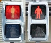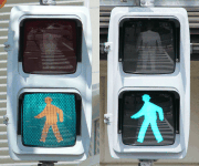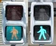 信号機の中には、記号や標示板により対象となる交通を特定しているものがあります。人の形の記号がある信号機(「歩行者用灯器」と呼ぶ)は歩行者と道交法第63条の3の自転車を対象にしています。