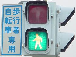 「歩行者・自転車専用」の標示板がある歩行者用灯器の信号 自転車もこの歩行者用灯器の信号に従わなければなりません。 |