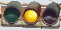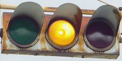 黄色の灯火の矢印 路面電車に対する信号であって、歩行者や車両は、進んではいけません。路面電車は矢印の方向に進むことができます。 |