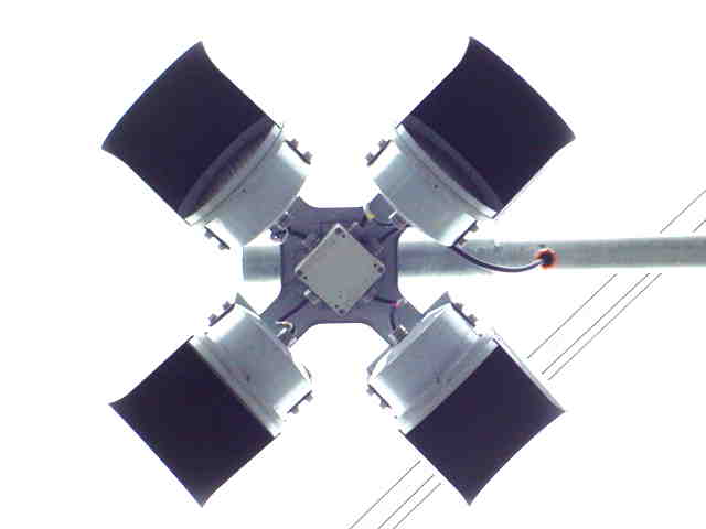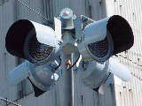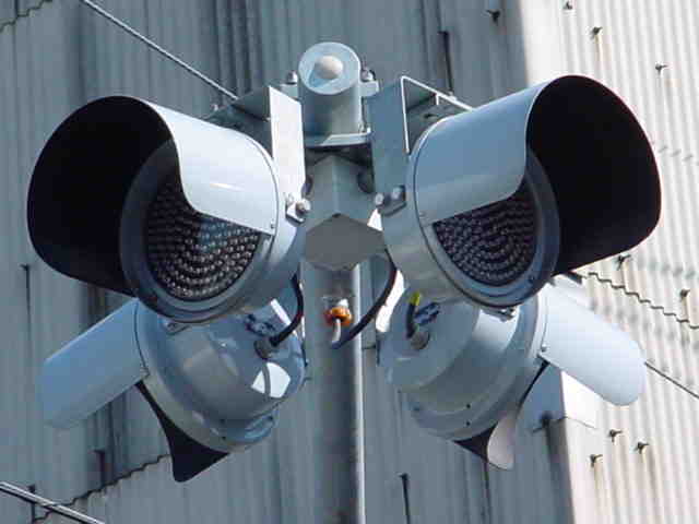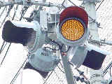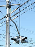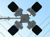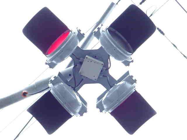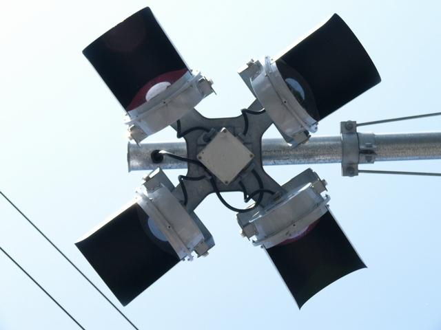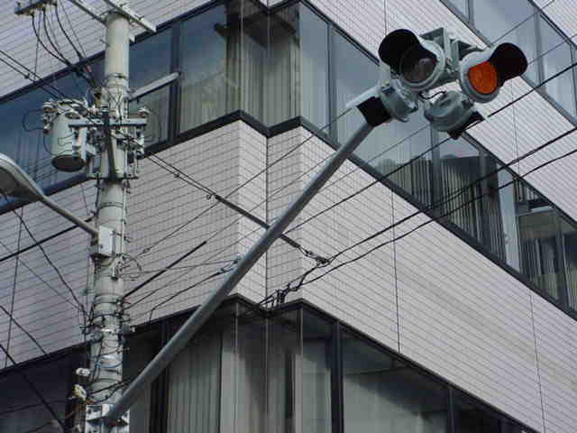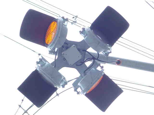 こちらはオフィス街で、平日は交通量の多い、一方通行路同士の交差点です。道路が斜めに交差しているので、灯器もそれに合わせて角度調整されています。