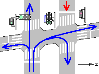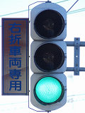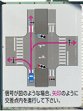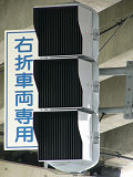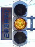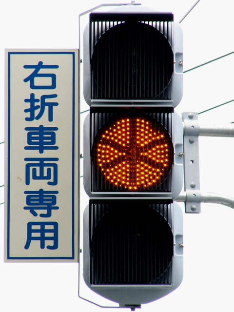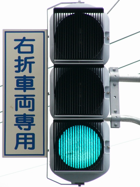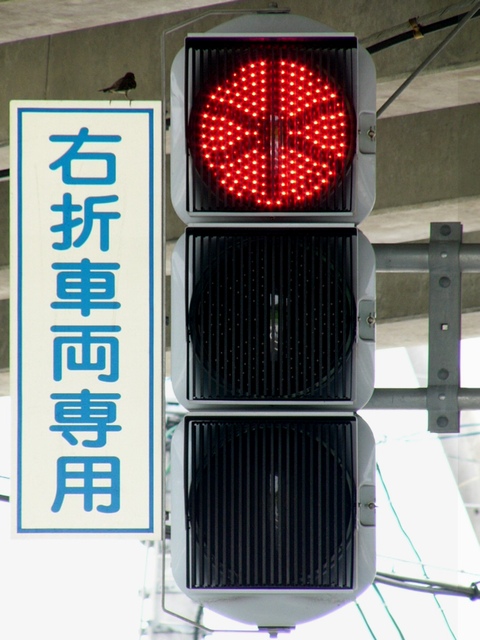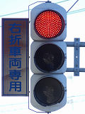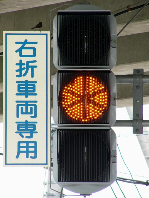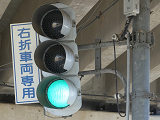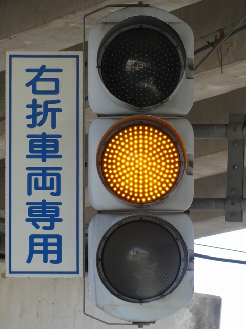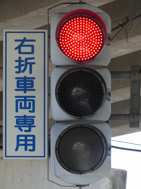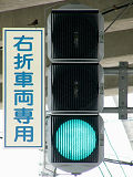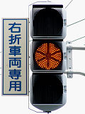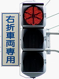 「右折車両専用」の灯器に左右制限フードが設置されています。交差点内に進入した右折車両が交差側道路の赤信号で誤って停止するのを防ぐために、交差点内に進入した右折車両から見やすい位置に設置されており、そのため逆に交差側車両が誤認しないように左右制限フードが設置されています。交差側車両が誤認しないように「右折車両専用」標示板が設置されていますが、信号サイクルは本信号と同じです。