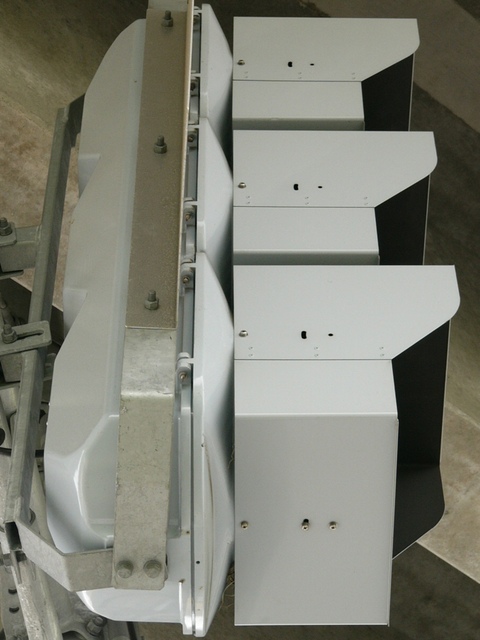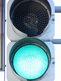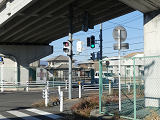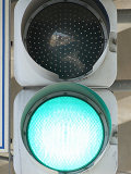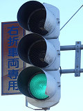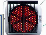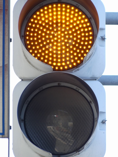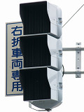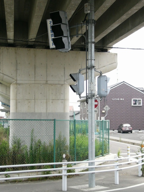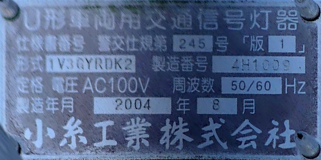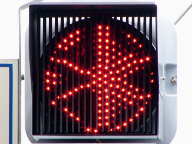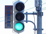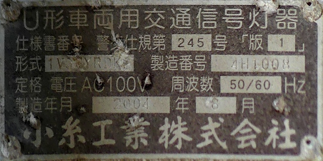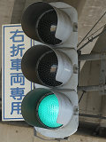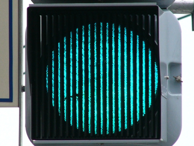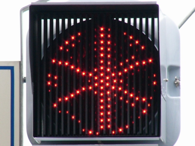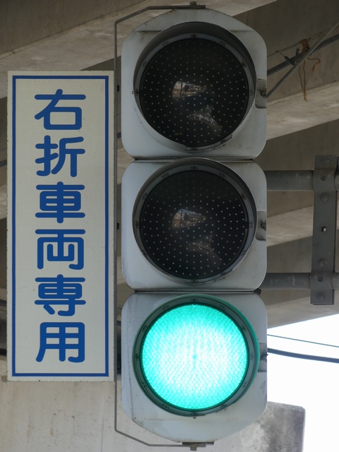 青灯、黄灯、赤灯ともLED式ですが、青灯はレンズユニット方式、黄灯、赤灯は素子型となっています。(この交差点のほかの灯器はすべて素子型LED式です。) 素子型は左右制限フードの縦板と干渉して、正面から見ると「*」形の部分が消えているように見えます。また、斜めから見ると逆に「*」印の部分のみが点灯しているように見えます。この干渉現象を防ぐために、重要な青灯のみがレンズユニット方式になっているようです。(前述したように、この信号は右折車両を進行させる役割の強い信号です。)