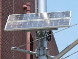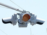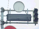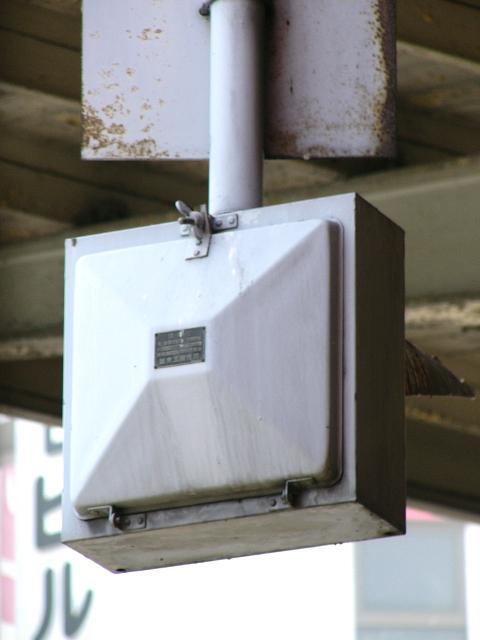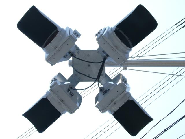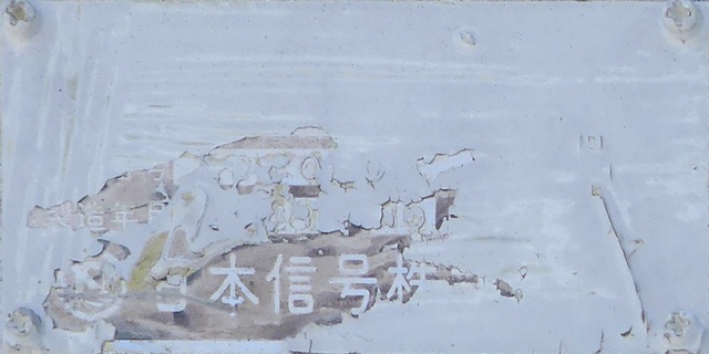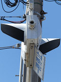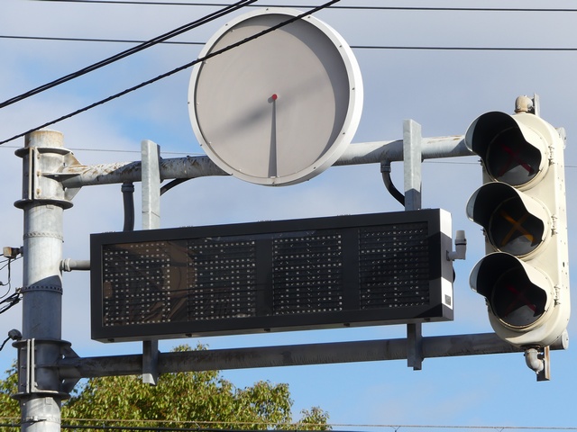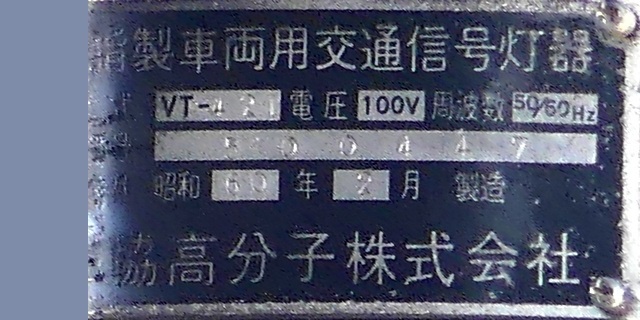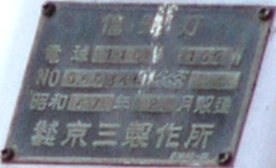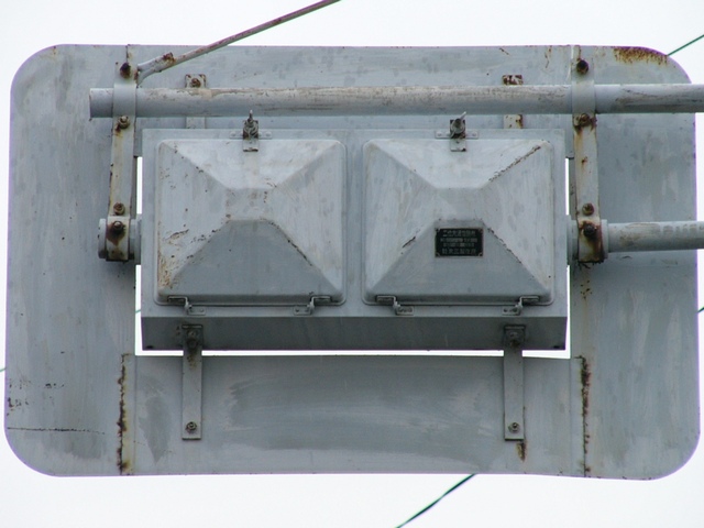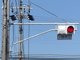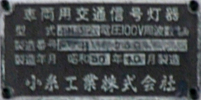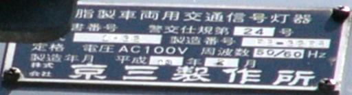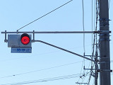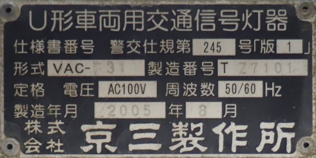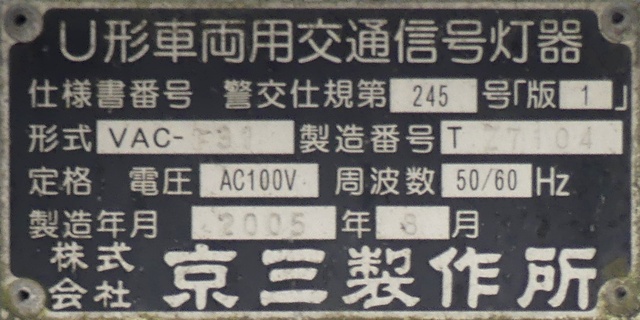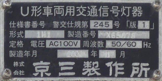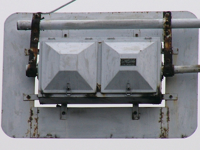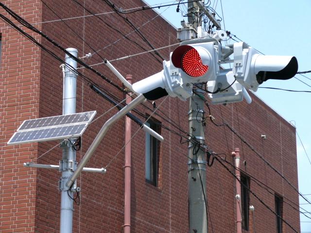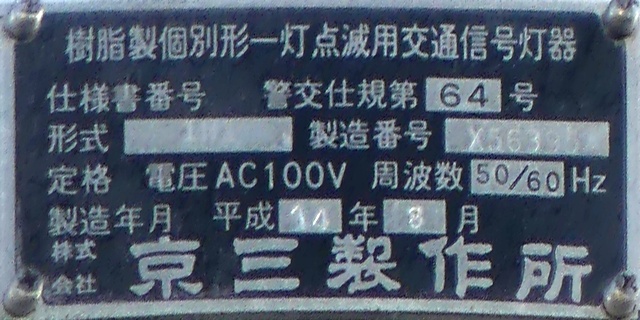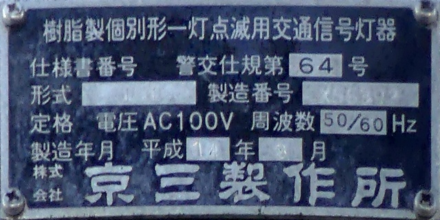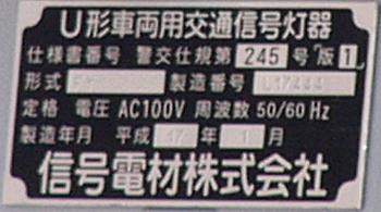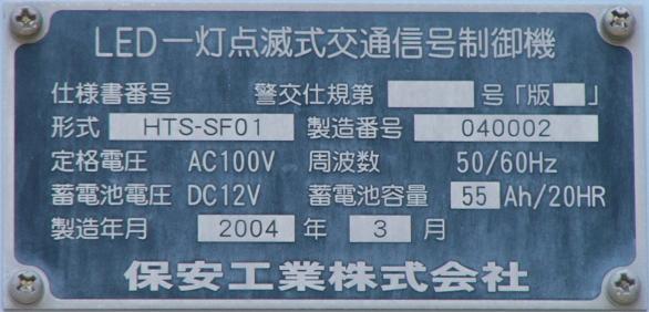 当初、灯器は日本信号製で直径200mmの小型のもの、制御機も日本信号製のものが設置され、ソーラーパネルが2枚設置されていましたが、後に、信号電材製で直径300mmの通常の灯器、保安工業製の制御機に交換され、ソーラーパネル1枚に改良されました。 なお、電源が通常と異なるためか、肉眼で見て点滅中1回点灯している間に、デジカメの液晶画面で見ると4回くらい細かく点滅しているように見えます(再現GIFアニメ←チカチカしているので、あまりじっくり見ないで下さい)。 制御機の銘板には蓄電池についても書かれています。 |