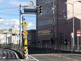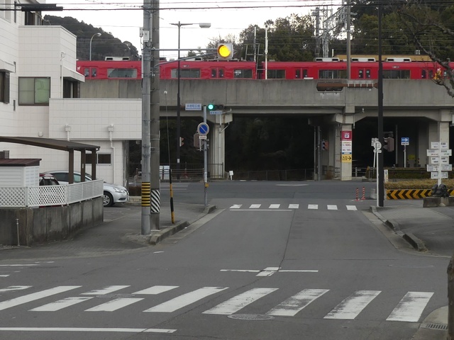 片側1車線の道路と片側0.7車線の道路の交差点です。従道路は旧街道で横断歩道が必要となるものの、すぐ先に信号で交通整理された大きな交差点があるため、横断歩道を見落とさないよう信号機を設置しているようです。 |