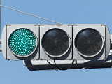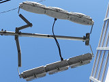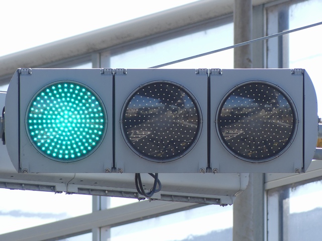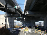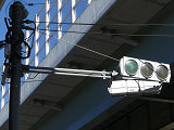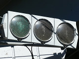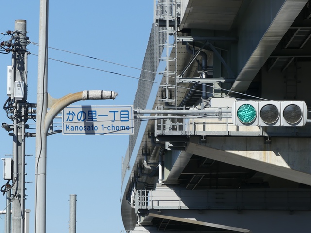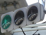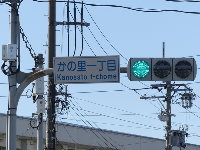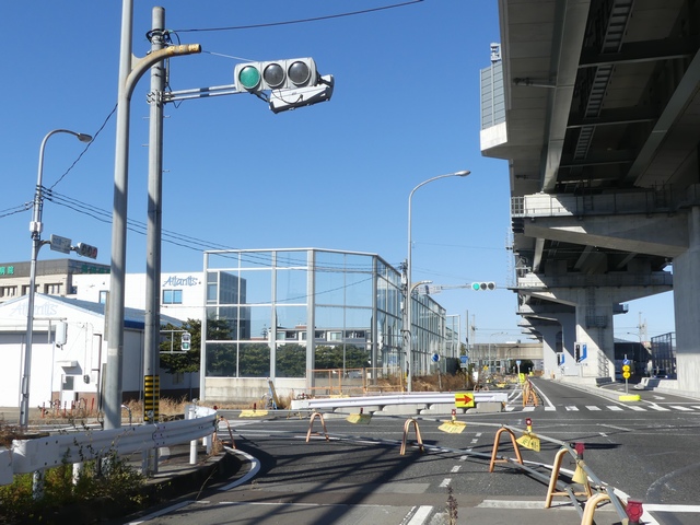 工事で走行車線の位置が頻繁に遷移するためか、仮設灯器扱いのようで、フードのない薄型灯器が設置されています。ある程度灯箱の種類は揃えているようですが、製造年月がばらばらで寄せ集めのようです。