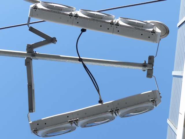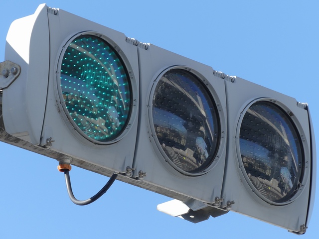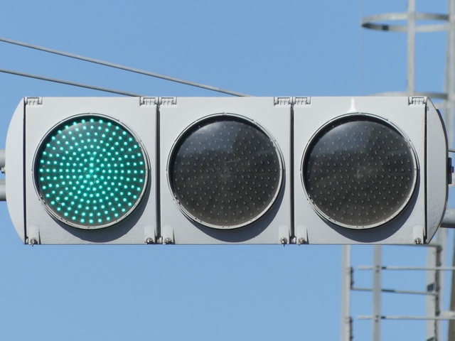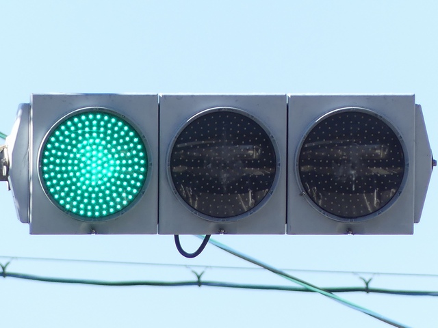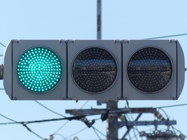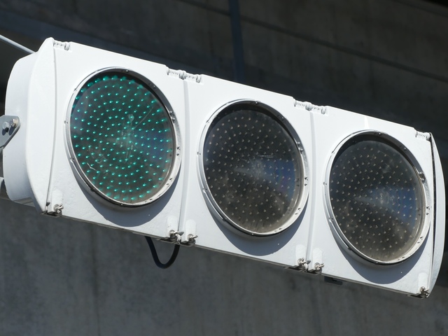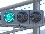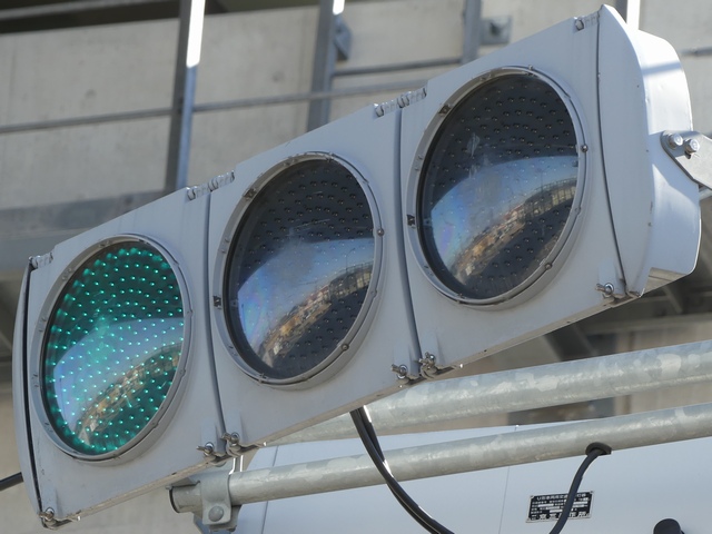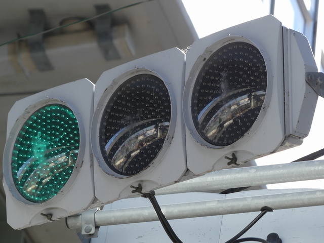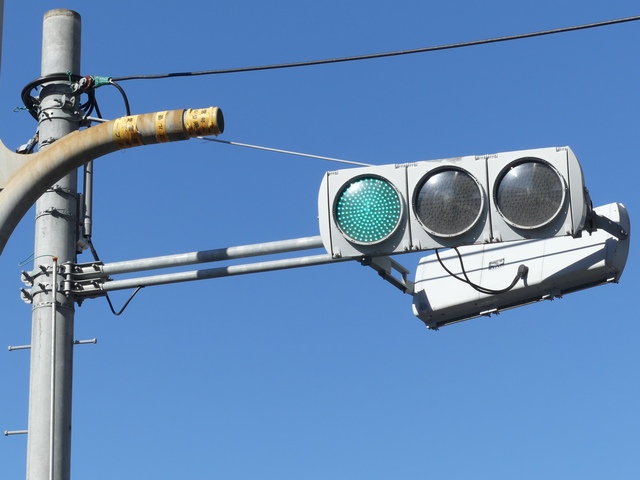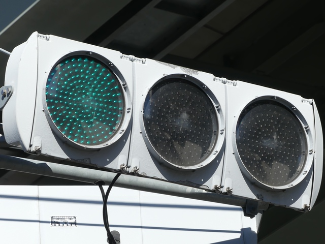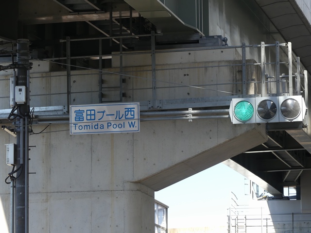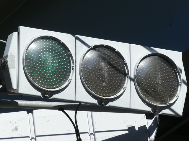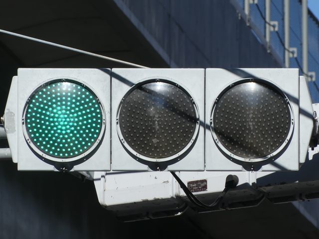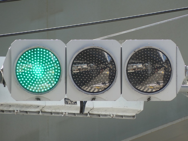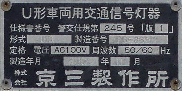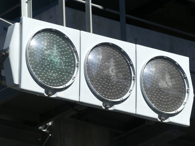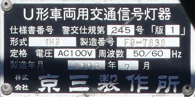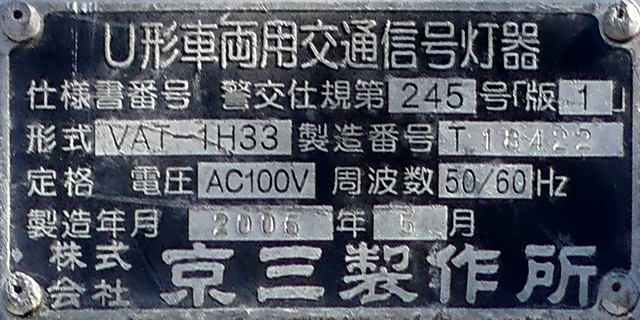 工事で走行車線の位置が頻繁に遷移するためか、仮設灯器扱いのようで、フードのない薄型灯器が設置されています。灯箱の種類は揃えているようですが、製造年月がばらばらで寄せ集めのようです。