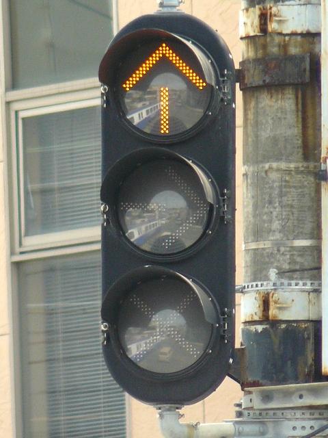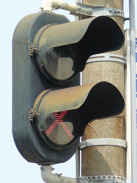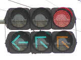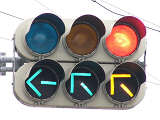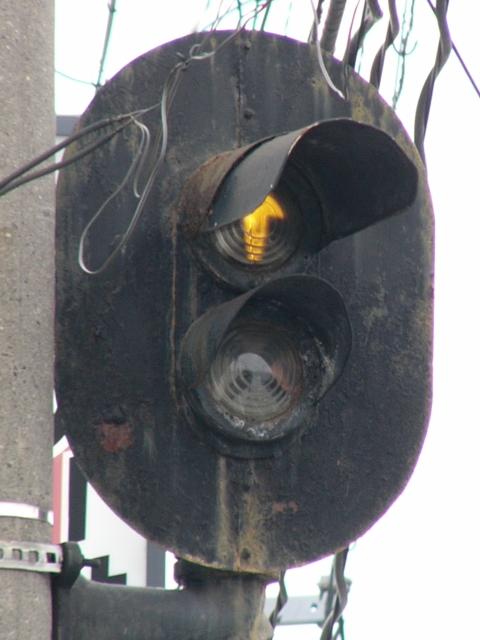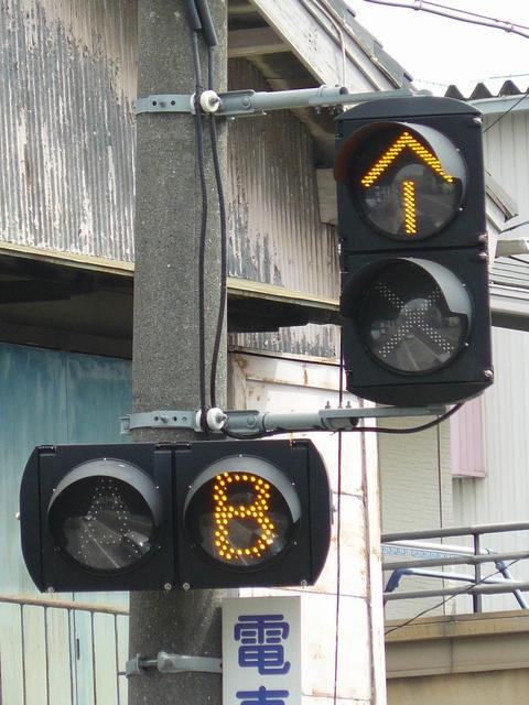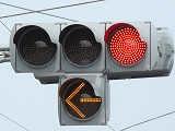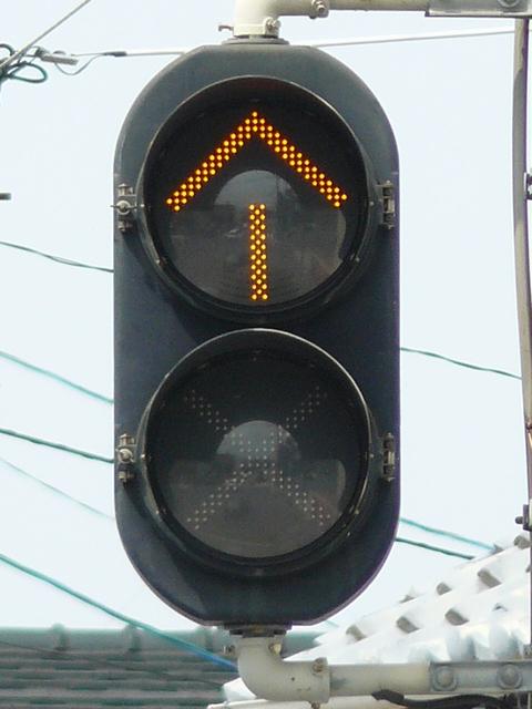 以前は鉄道用っぽい灯器でしたが、併用軌道上なので、進行できるときには黄矢印が表示されました。2位式のほうは上のフードが長くなっていました。