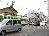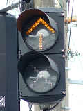 路面電車が屈折する交差点です。安全のため、ここでは電車は青信号で進行せず、黄矢印信号が出たときに進行するようです。