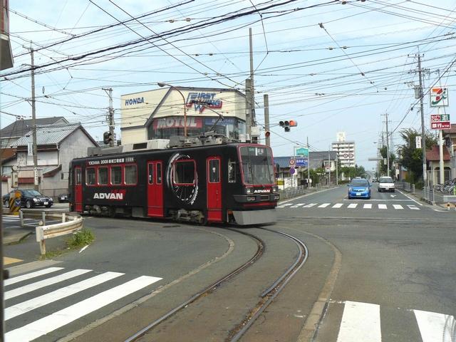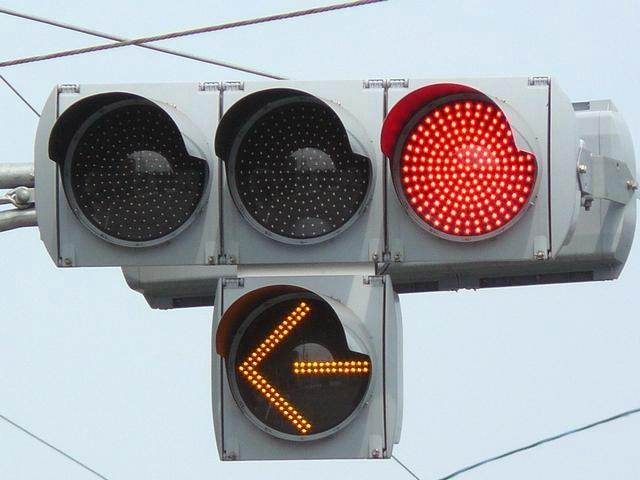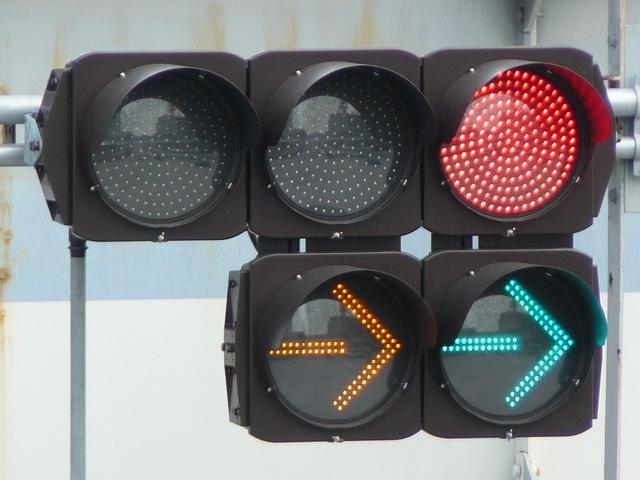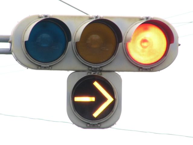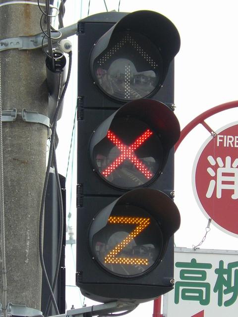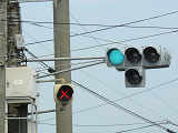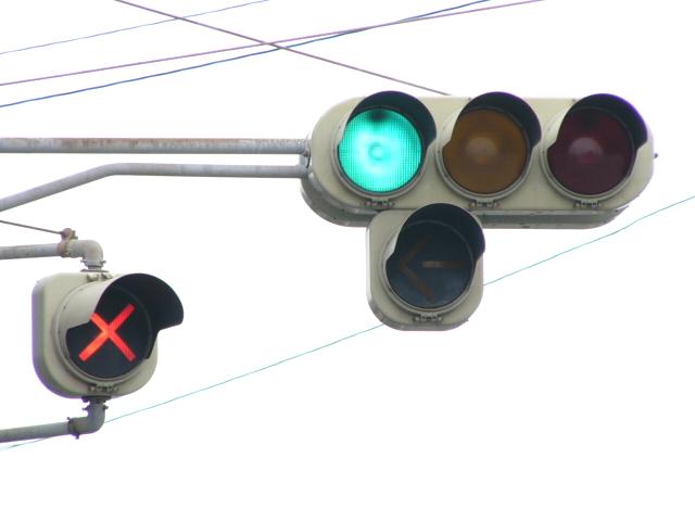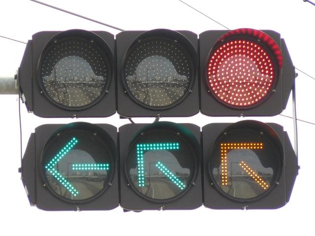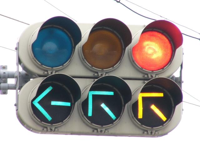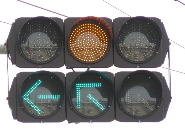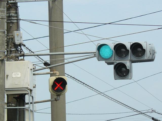 R1から分岐する交差点です。安全のため、ここでは電車は青信号で進行せず、黄矢印信号が出たときに進行するようです。