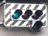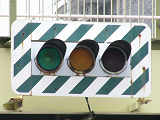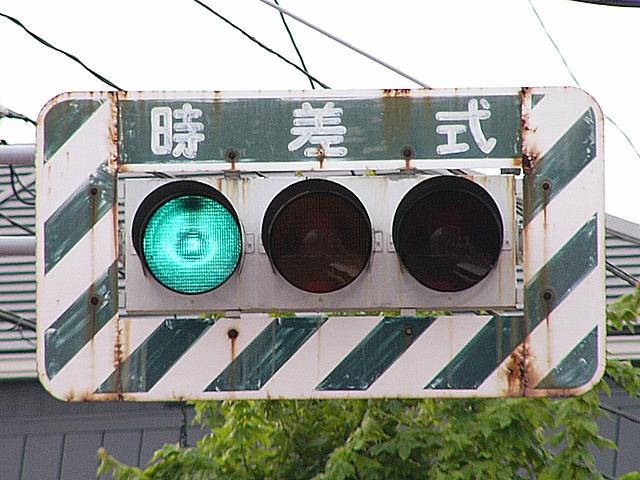 小糸製作所製(製造年不明)の直径250mmレンズ灯器です。歩道橋に設置されているため、背面板が残されています。塗装がはげ、元の緑塗装が見えています。
